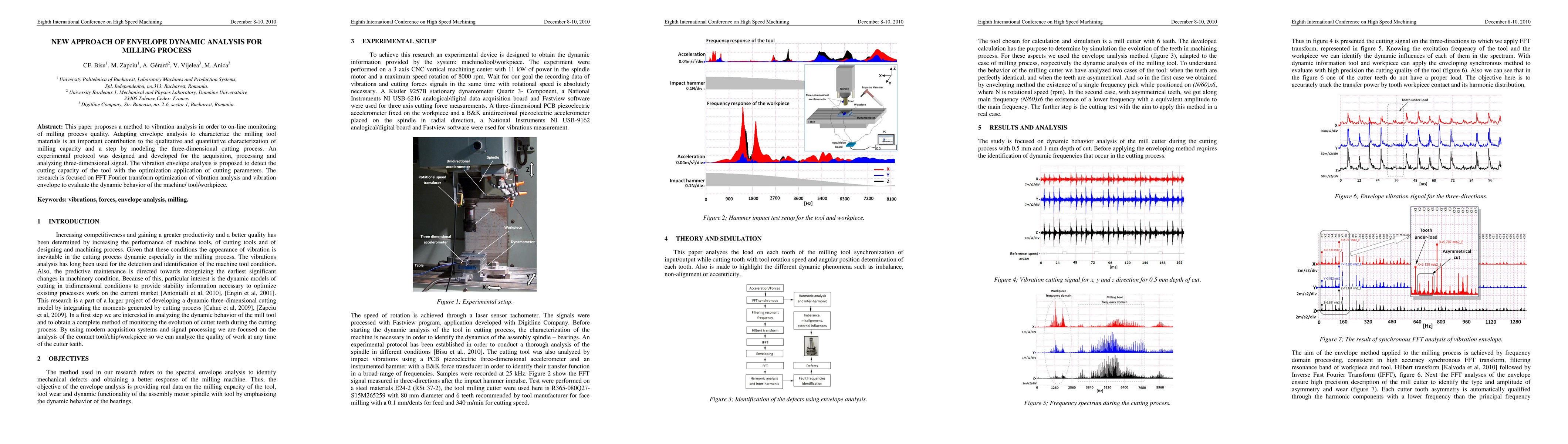 This paper introduces a new envelope dynamic analysis method for real-time milling process monitoring, optimizing FFT Fourier transform for vibration analysis to characterize milling tool materials and evaluate the dynamic behavior of the machine/tool/workpiece system. Experimental results demonstrate the method's effectiveness in assessing cutting capacity and optimizing cutting parameters.