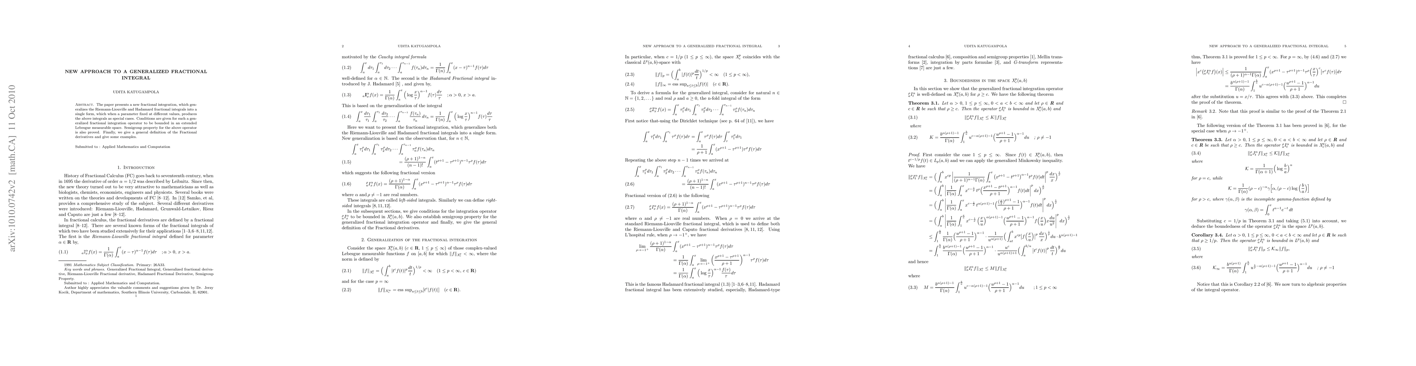 The paper presents a new formula for the fractional integration, which generalizes the Riemann-Liouville and Hadamard fractional integrals into a single form, which when a parameter fixed at different values, produces the above integrals as special cases. Conditions are given for such a generalized fractional integration operator to be bounded in an extended Lebesgue measurable space. Semigroup property for the above operator is also proved. Finally, we give a general definition of the Fractional derivatives.