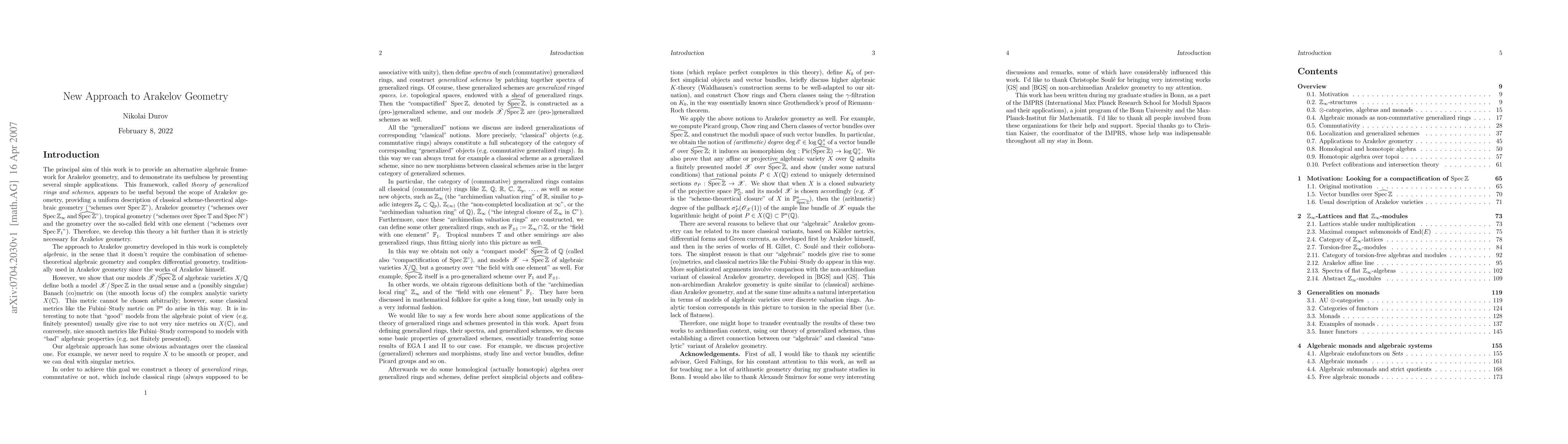 This paper introduces a new algebraic approach to Arakelov geometry, eliminating the need for varieties to be generically smooth or projective. It develops a theory of generalized rings and schemes, incorporating classical objects and exotic entities like F_1 and Z_\infty, and constructs algebraic K-theory, intersection theory, and Chern classes within this framework.