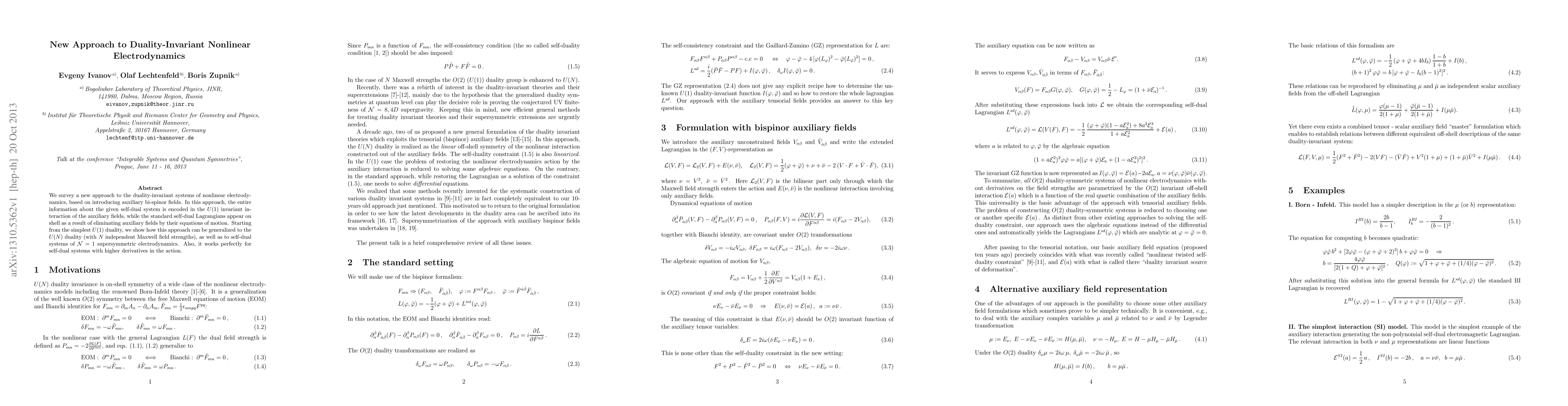 We survey a new approach to the duality-invariant systems of nonlinear electrodynamics, based on introducing auxiliary bi-spinor fields. In this approach, the entire information about the given self-dual system is encoded in the U(1) invariant interaction of the auxiliary fields, while the standard self-dual Lagrangians appear on shell as a result of eliminating auxiliary fields by their equations of motion. Starting from the simplest U(1) duality, we show how this approach can be generalized to the U(N) duality (with N independent Maxwell field strengths), as well as to self-dual systems of {\cal N}=1 supersymmetric electrodynamics. Also, it works perfectly for self-dual systems with higher derivatives in the action.
