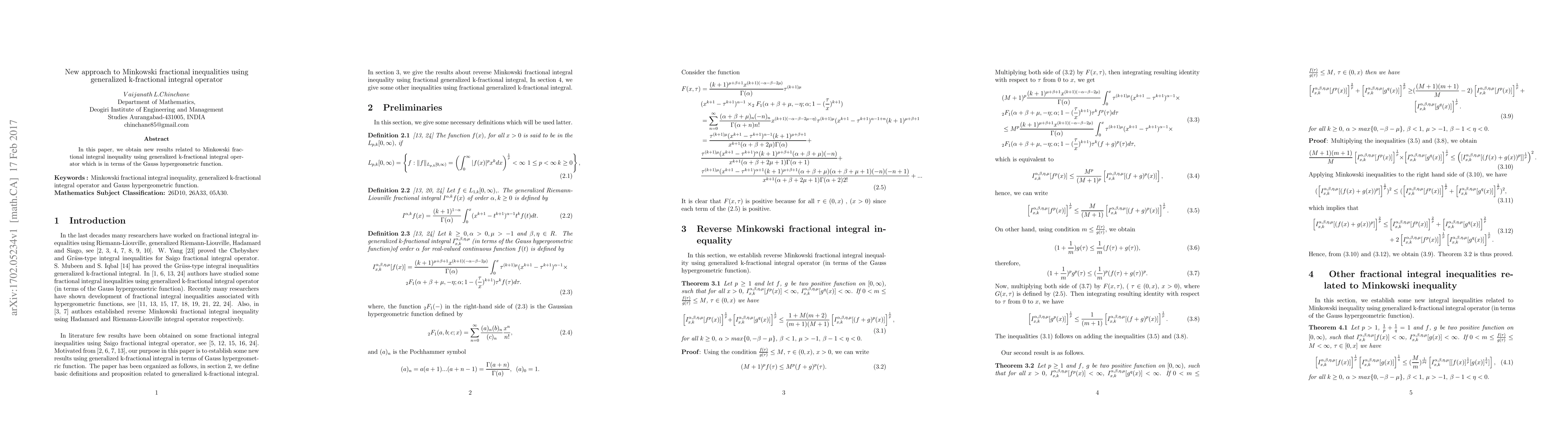 Summary: This paper introduces a novel approach to Minkowski fractional inequalities utilizing a generalized k-fractional integral operator expressed through the Gauss hypergeometric function, yielding new theoretical results.