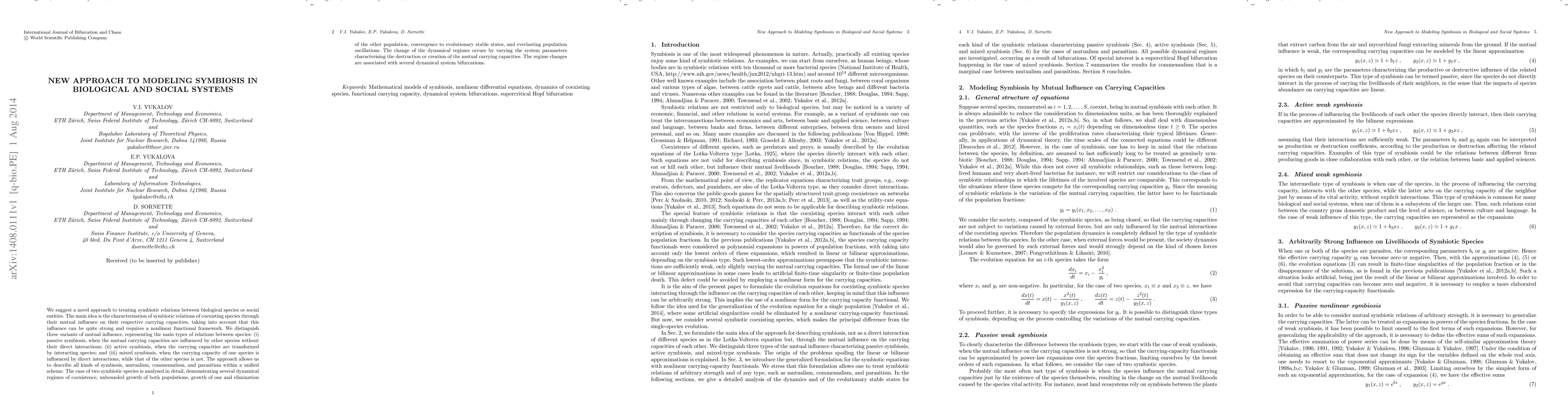 This paper proposes a new nonlinear functional framework to model symbiotic relations in biological and social systems, distinguishing three types of mutual influence: passive, active, and mixed symbiosis. It demonstrates various dynamical regimes of coexistence through detailed analysis of two symbiotic species, highlighting bifurcations associated with regime changes.