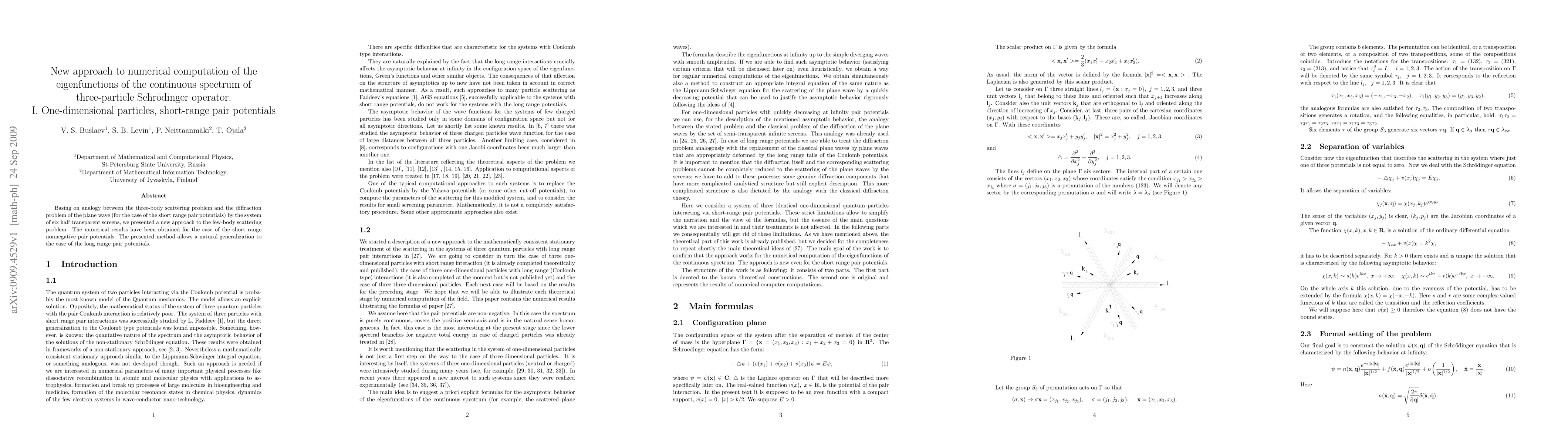 Basing on analogy between the three-body scattering problem and the diffraction problem of the plane wave (for the case of the short range pair potentials) by the system of six half transparent screens, we presented a new approach to the few-body scattering problem. The numerical results have been obtained for the case of the short range nonnegative pair potentials. The presented method allows a natural generalization to the case of the long range pair potentials.