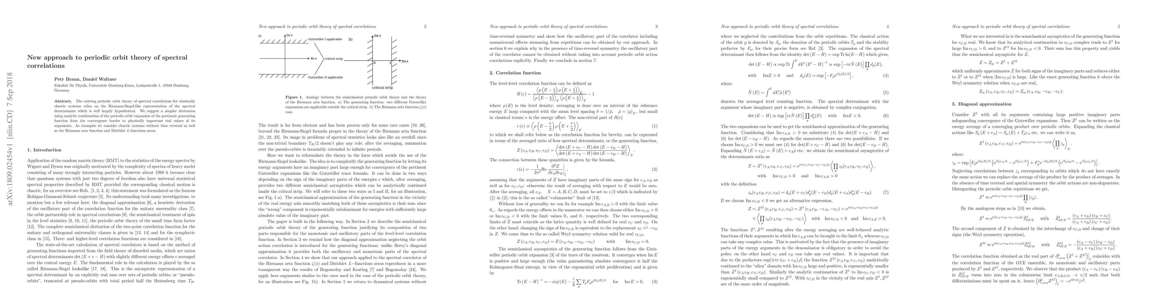 The existing periodic orbit theory of spectral correlations for classically chaotic systems relies on the Riemann-Siegel-like representation of the spectral determinants which is still largely hypothetical. We suggest a simpler derivation using analytic continuation of the periodic-orbit expansion of the pertinent generating function from the convergence border to physically important real values of its arguments. As examples we consider chaotic systems without time reversal as well as the Riemann zeta function and Dirichlet L-functions zeros.