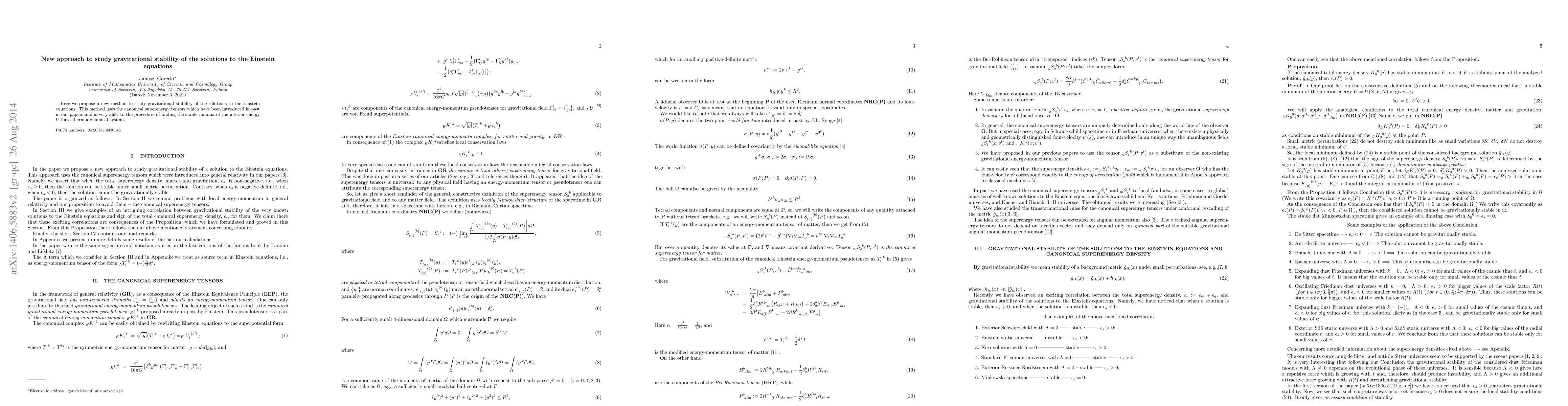 Here we propose a new method to study gravitational stability of the solutions to the Einstein equations. This method uses the canonical superenergy density and it is different from approaches already used (Lyapunov's stability, dynamical systems). Our method is very alike to the procedure of finding the stable minima of the interior energy U for a dynamical system.