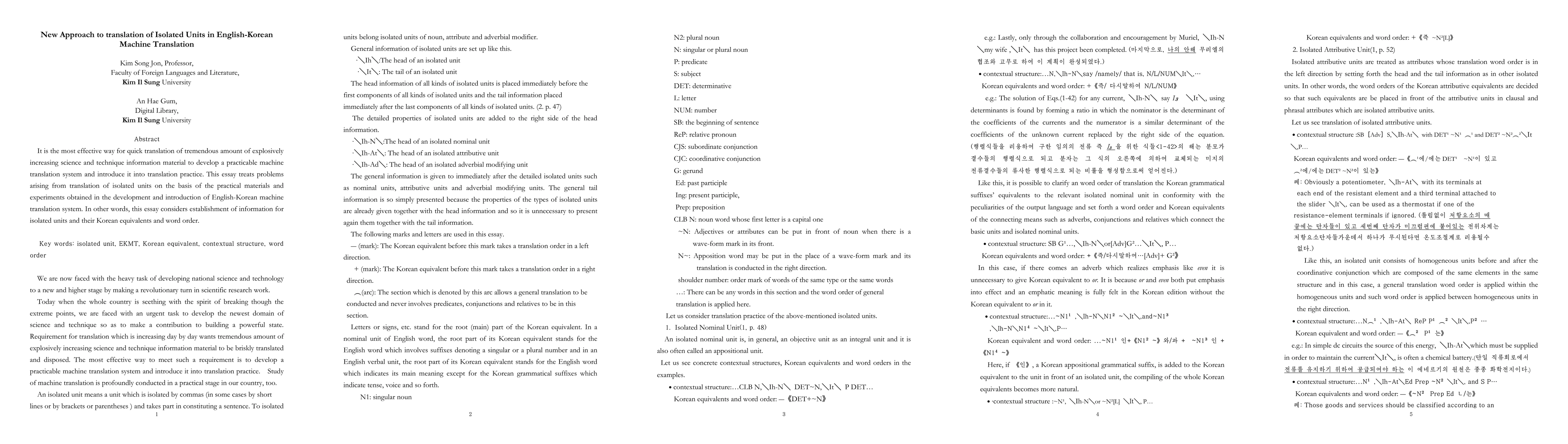 It is the most effective way for quick translation of tremendous amount of explosively increasing science and technique information material to develop a practicable machine translation system and introduce it into translation practice. This essay treats problems arising from translation of isolated units on the basis of the practical materials and experiments obtained in the development and introduction of English-Korean machine translation system. In other words, this essay considers establishment of information for isolated units and their Korean equivalents and word order.