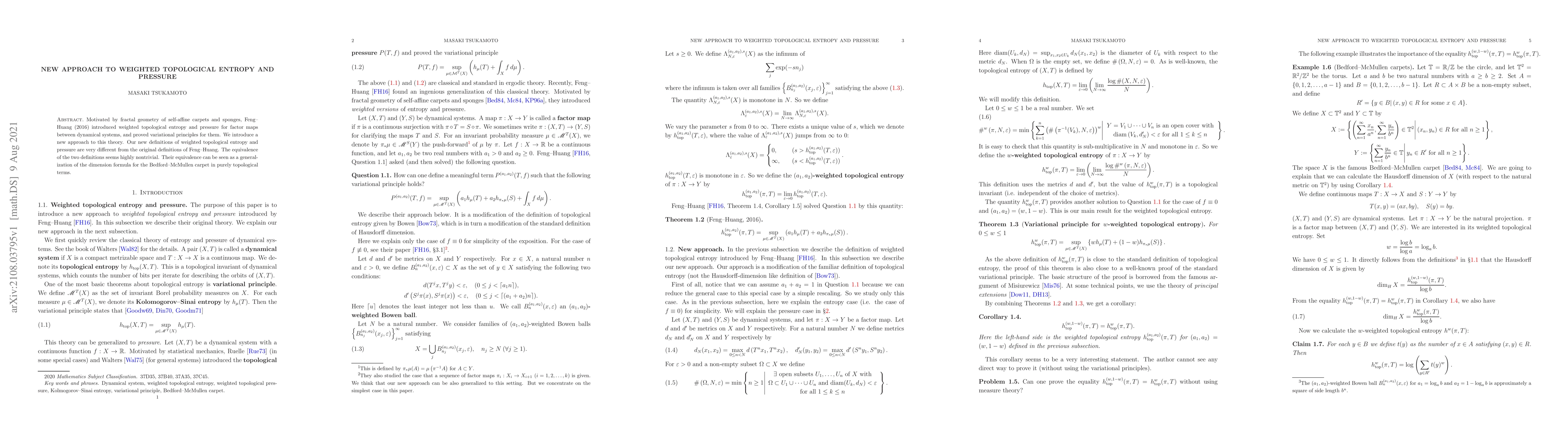 Motivated by fractal geometry of self-affine carpets and sponges, Feng--Huang (2016) introduced weighted topological entropy and pressure for factor maps between dynamical systems, and proved variational principles for them. We introduce a new approach to this theory. Our new definitions of weighted topological entropy and pressure are very different from the original definitions of Feng--Huang. The equivalence of the two definitions seems highly nontrivial. Their equivalence can be seen as a generalization of the dimension formula for the Bedford--McMullen carpet in purely topological terms.