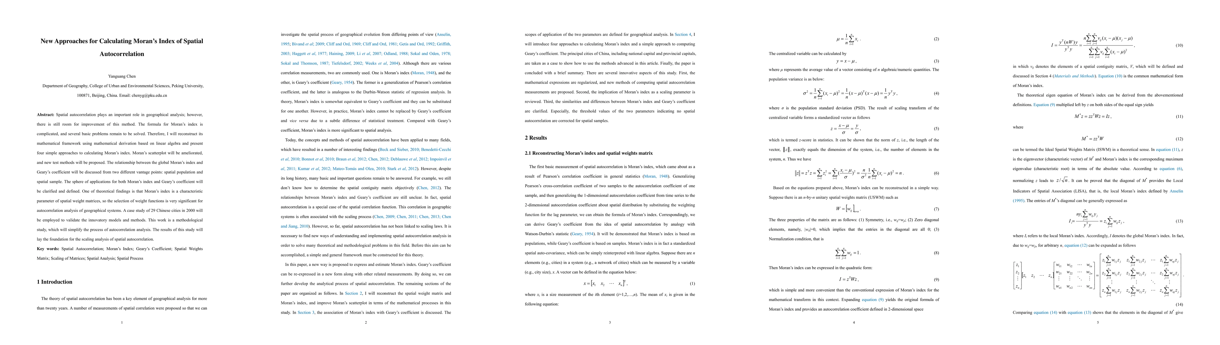 This paper proposes new mathematical frameworks and simplified approaches for calculating Moran's index of spatial autocorrelation, including improved scatterplots and test methods. It also clarifies the relationship between Moran's index and Geary's coefficient, emphasizing the importance of weight function selection, and validates the methods with a case study of 29 Chinese cities.