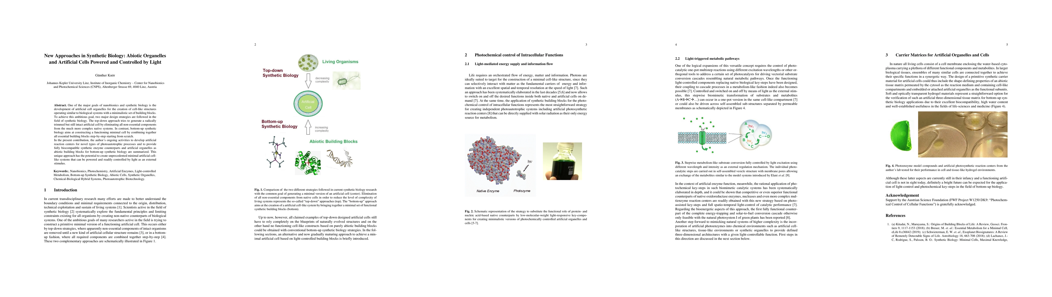 This paper explores innovative synthetic biology methods to create artificial cell organelles powered and controlled by light, aiming to develop minimalistic, biocompatible systems mimicking biological processes. These abiotic organelles can undergo photoautotrophic processes and substrate photo-conversion, offering a new way to manipulate cell-like structures with light.