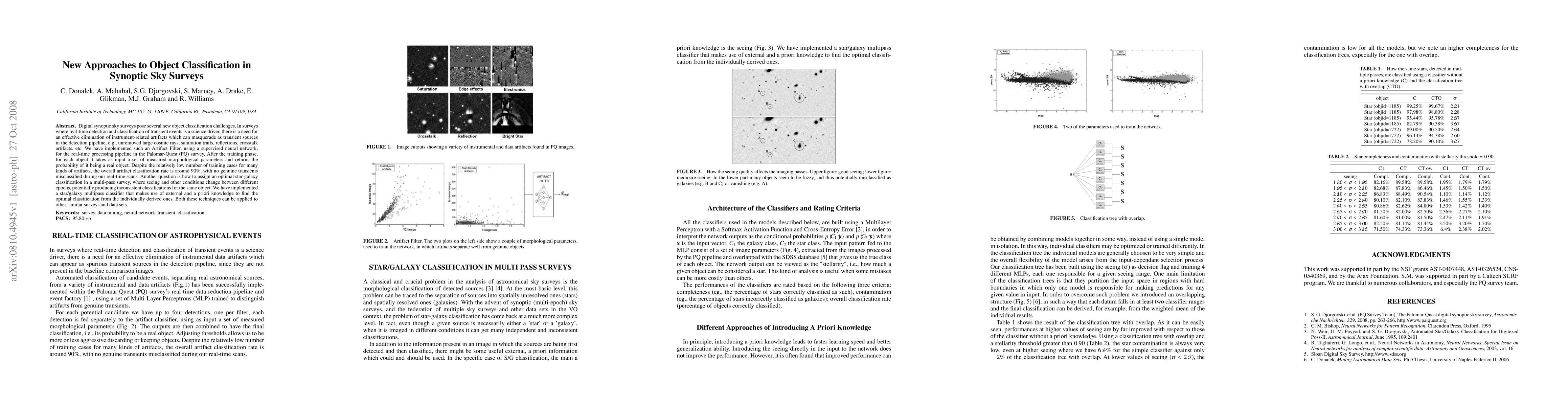 This paper introduces a supervised neural network-based Artifact Filter for Palomar-Quest sky survey to effectively eliminate instrument-related artifacts from transient event detection, achieving a 90% classification rate with no misclassification of genuine transients. Additionally, it presents a star/galaxy multipass classifier that leverages external knowledge to optimize classifications across varying survey conditions.