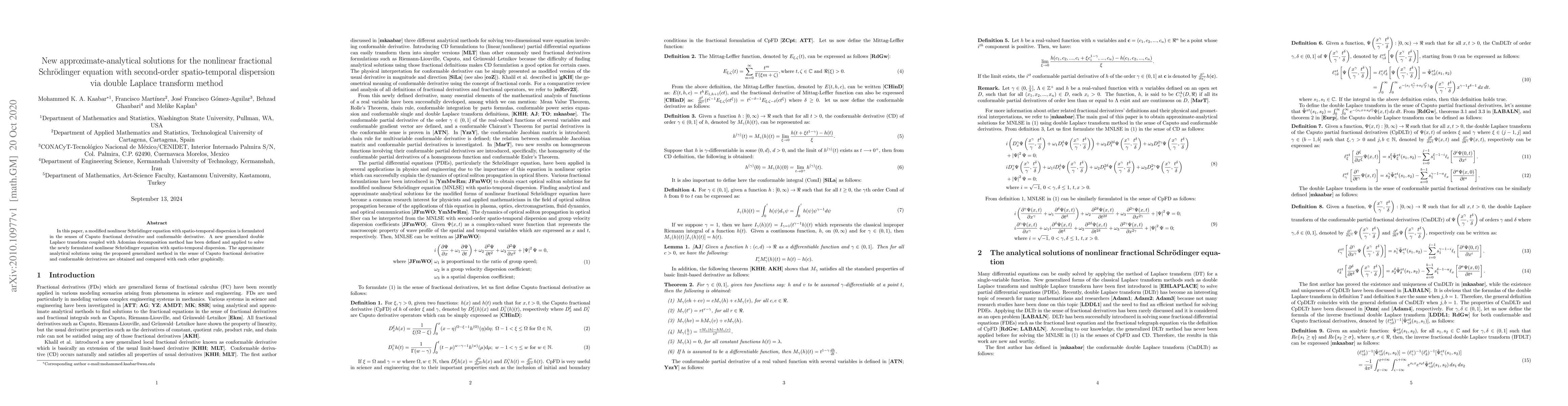 In this paper, a modified nonlinear Schr\"{o}dinger equation with spatio-temporal dispersion is formulated in the senses of Caputo fractional derivative and conformable derivative. A new generalized double Laplace transform coupled with Adomian decomposition method has been defined and applied to solve the newly formulated nonlinear Schr\"{o}dinger equation with spatio-temporal dispersion. The approximate analytical solutions using the proposed generalized method in the sense of Caputo fractional derivative and conformable derivatives are obtained and compared with each other graphically.