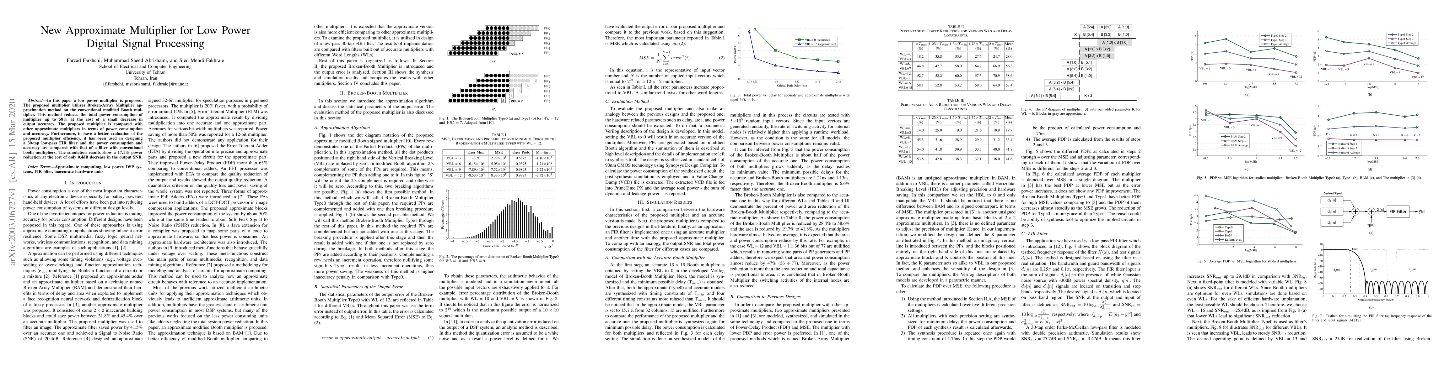 This paper proposes a low power multiplier using the Broken-Array Multiplier approximation method on a conventional modified Booth multiplier, achieving up to 58% power reduction with a minor decrease in accuracy. The efficiency is demonstrated through its application in a 30-tap low-pass FIR filter, showing a 17.1% power reduction and only a 0.4dB decrease in output SNR.