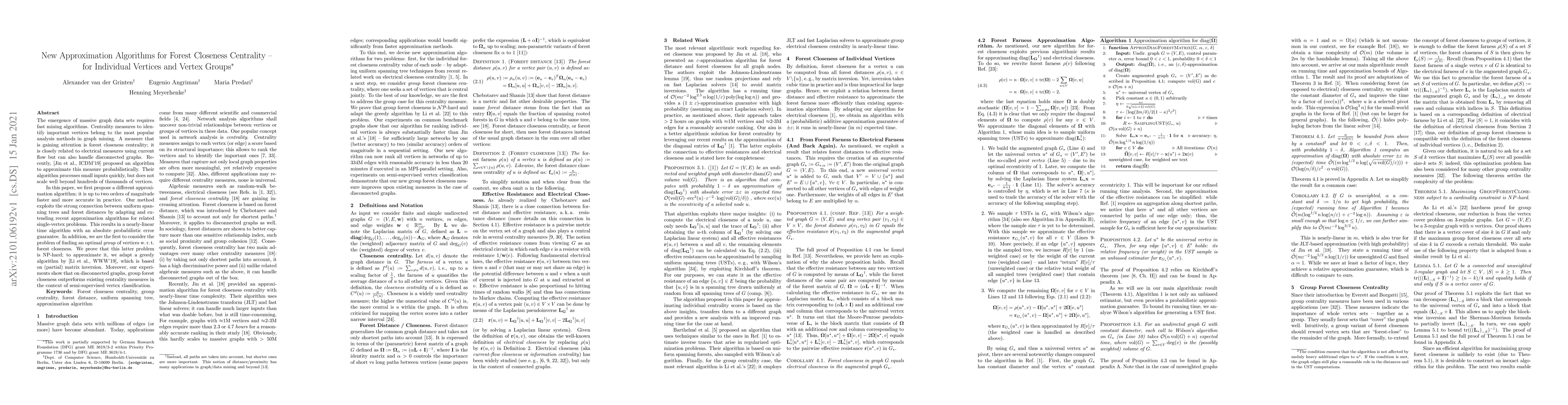 This paper introduces a new approximation algorithm for forest closeness centrality that is significantly faster and more accurate than existing methods, especially for large graphs. It also extends the approach to approximate the centrality of vertex groups, demonstrating improved performance in semi-supervised vertex classification on disconnected graphs.