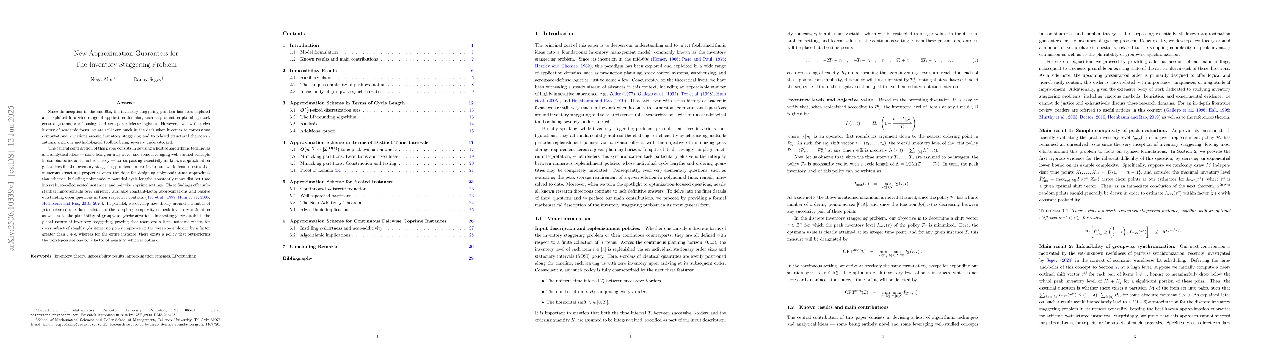 Researchers developed new methods to improve approximation guarantees for the inventory staggering problem, showing that certain structural properties allow for polynomial-time solutions and resolving open questions in related fields.