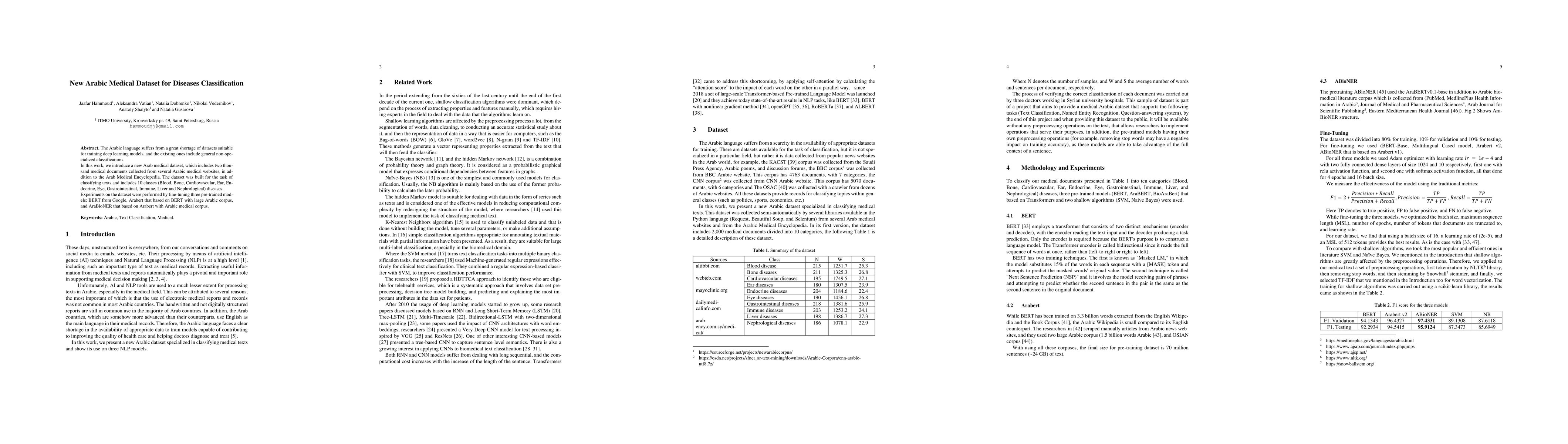 The paper introduces a new Arabic medical dataset with 2,000 documents covering 10 disease classes to address the lack of specialized datasets for deep learning. Experiments fine-tuned BERT, Arabert, and AraBioNER models to classify the texts.