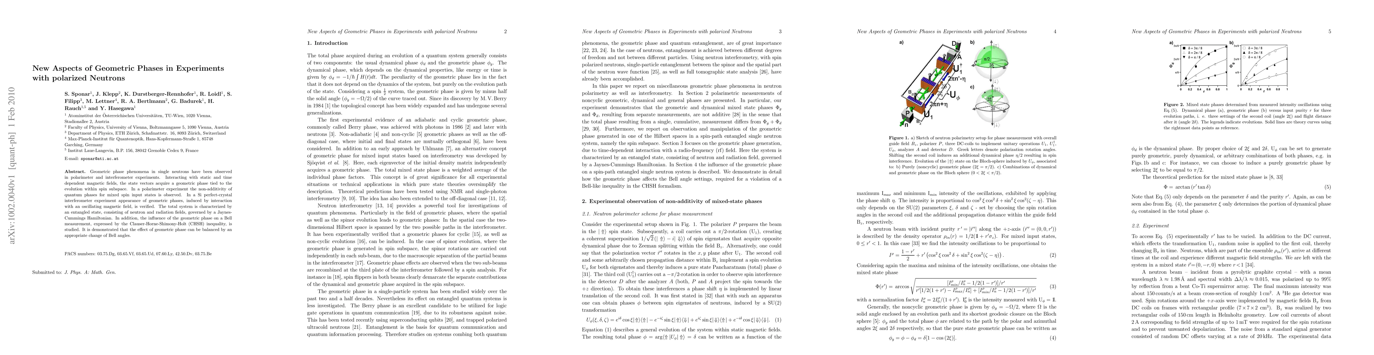 Geometric phase phenomena in single neutrons have been observed in polarimeter and interferometer experiments. Interacting with static and time dependent magnetic fields, the state vectors acquire a geometric phase tied to the evolution within spin subspace. In a polarimeter experiment the non-additivity of quantum phases for mixed spin input states is observed. In a Si perfect-crystal interferometer experiment appearance of geometric phases, induced by interaction with an oscillating magnetic field, is verified. The total system is characterized by an entangled state, consisting of neutron and radiation fields, governed by a Jaynes-Cummings Hamiltonian. In addition, the influence of the geometric phase on a Bell measurement, expressed by the Clauser-Horne-Shimony-Holt (CHSH) inequality, is studied. It is demonstrated that the effect of geometric phase can be balanced by an appropriate change of Bell angles.