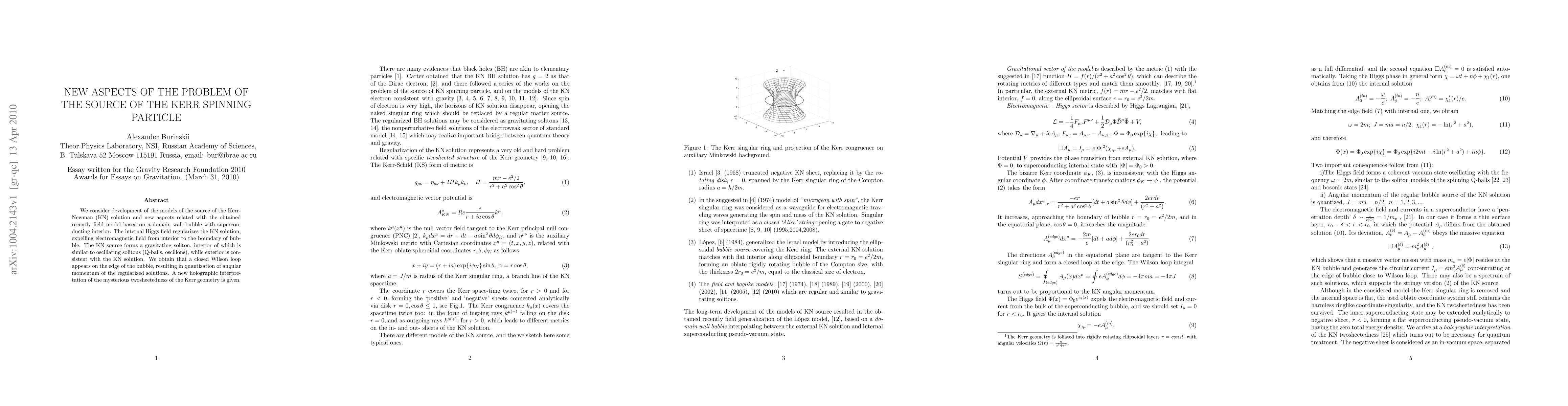 We consider development of the models of the source of the Kerr-Newman (KN) solution and new aspects related with the obtained recently field model based on a domain wall bubble with superconducting interior, arXiv:1003.2928[hep-th]. The internal Higgs field regularizes the KN solution, expelling electromagnetic field from interior to the boundary of bubble. The KN source forms a gravitating soliton, interior of which is similar to oscillating solitons (Q-balls, oscillons), while exterior is consistent with the KN solution. We obtain that a closed Wilson loop appears on the edge of the bubble, resulting in quantization of angular momentum of the regularized solutions. A new holographic interpretation of the mysterious twosheetedness of the Kerr geometry is given. The KN gravitating soliton with parameters of electron is discussed.