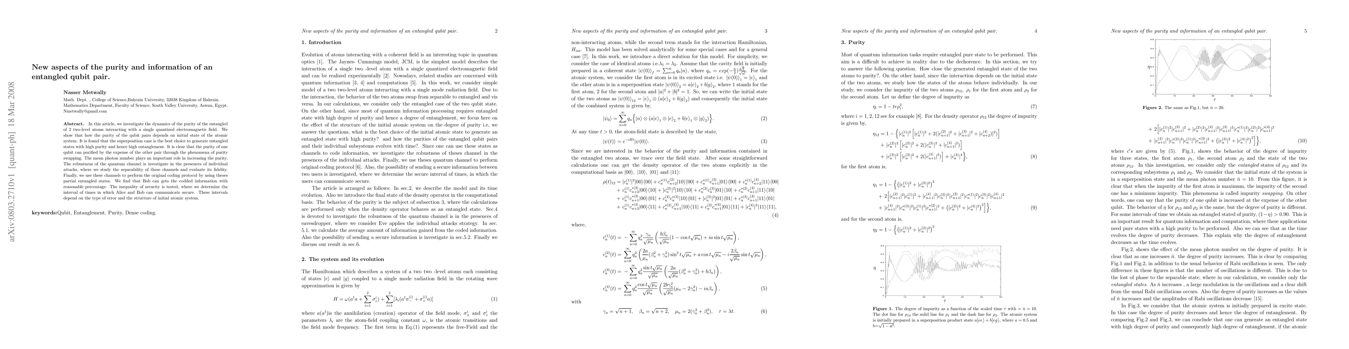 This paper explores the dynamics of purity in entangled qubit pairs interacting with a quantized electromagnetic field, demonstrating that superposition states yield high purity and entanglement. It also investigates purity swapping and the role of mean photon number, evaluates the robustness of quantum channels against attacks, and assesses secure communication intervals based on initial atomic system conditions.