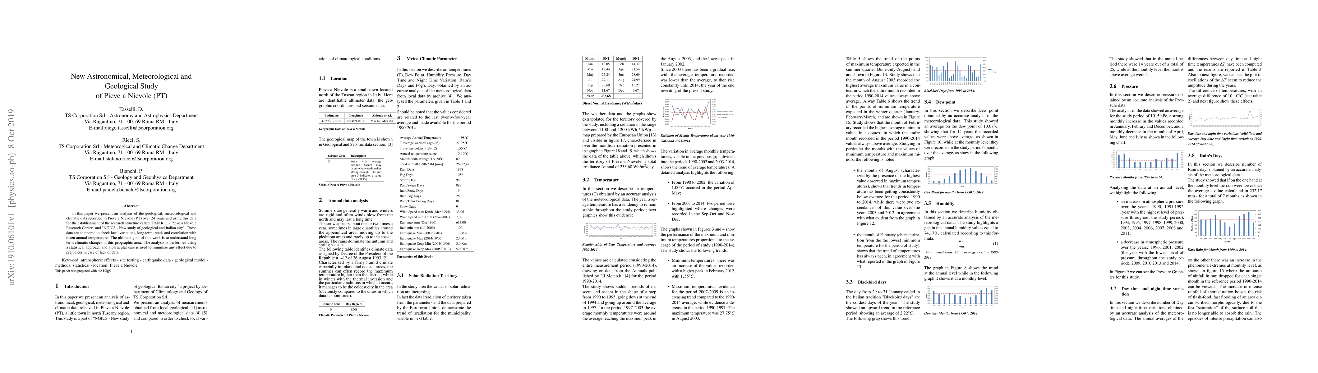 In this paper we present an analysis of the geological, meteorological and climatic data recorded in Pieve a Nievole (PT) over 24 years and using this data for the establishment of the research structure called "PAN.R.C. - Pieve a Nievole Research Center" and "NGICS - New study of geological and Italian city". These data are compared to check local variations, long term trends and correlation with maen annual temperature. The ultimate goal of this work is to understand long term climatic changes in this geographic area. The analysis is performed using a statistical approach and a particular care is used to minimize any effect due to prejudices in case of lack of data.