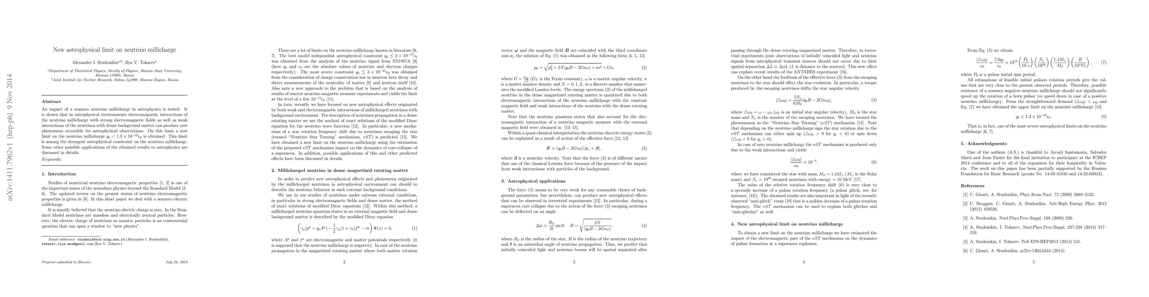 This paper establishes a new astrophysical limit on the neutrino millicharge, demonstrating that electromagnetic interactions in astrophysical environments can reveal new phenomena. The derived limit, $q_0<1.3\times10^{-19}e_0$, is one of the strongest constraints on the neutrino millicharge to date.