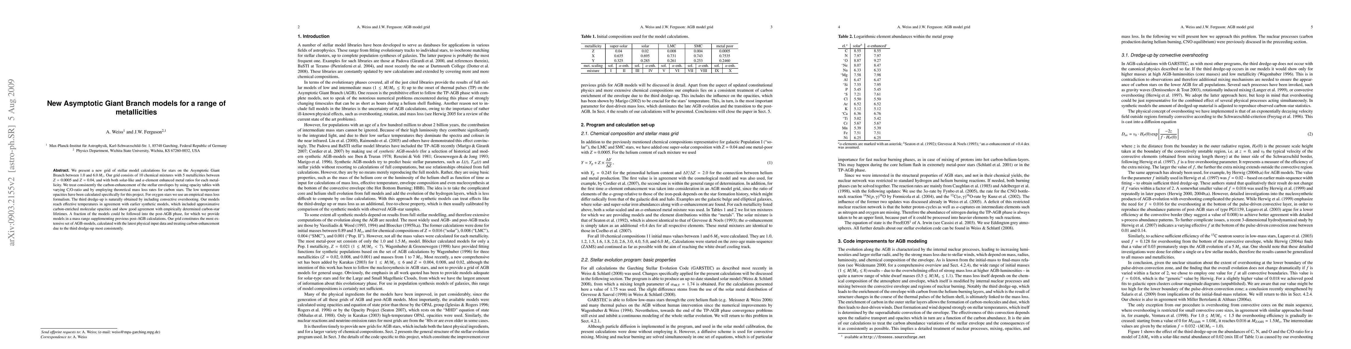 We present a new grid of stellar model calculations for stars on the Asymptotic Giant Branch between 1.0 and 6.0 M_sun. Our grid consists of 5 chemical mixtures between Z=0.0005 and Z=0.04, with both solar-like and $\alpha$-element enhanced metal ratios. We treat consistently the carbon-enhancement of the stellar envelopes by using opacity tables with varying C/O-ratio and by employing theoretical mass loss rates for carbon stars. The low temperature opacities have been calculated specifically for this project. For oxygen stars we use an empirical mass loss formalism. The third dredge-up is naturally obtained by including convective overshooting. Our models reach effective temperatures in agreement with earlier synthetic models, which included approximative carbon-enriched molecular opacities and show good agreement with empirically determined carbon-star lifetimes. A fraction of the models could be followed into the post-AGB phase, for which we provide models in a mass range supplementing previous post-AGB calculations. Our grid constitutes the most extensive set of AGB-models, calculated with the latest physical input data and treating carbon-enhancement due to the third dredge-up most consistently.