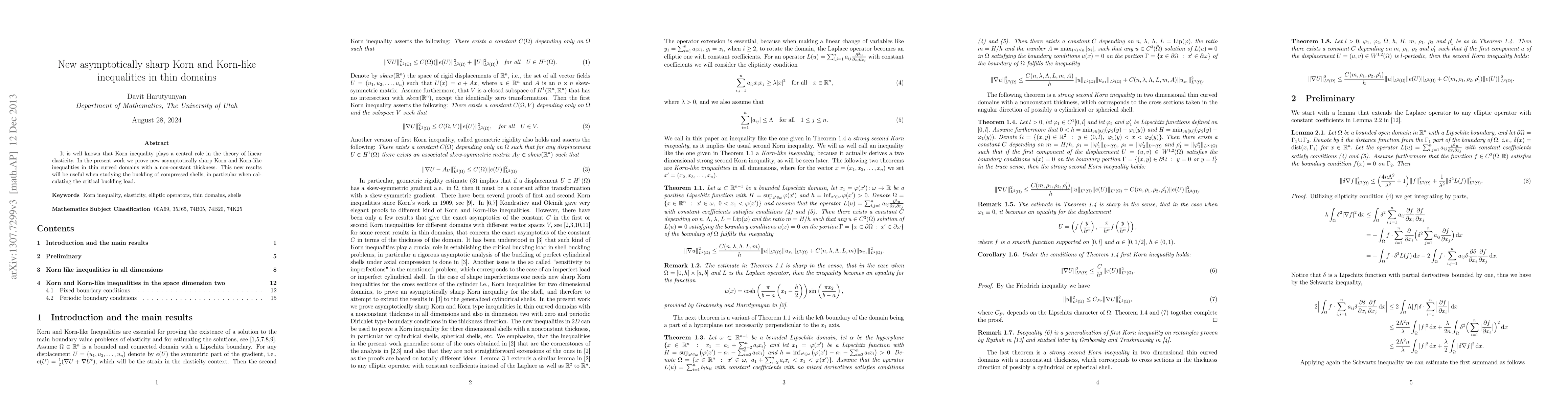 This paper establishes new asymptotically sharp Korn and Korn-like inequalities for thin curved domains with varying thickness, enhancing the theoretical framework for analyzing the buckling of compressed shells and calculating critical buckling loads.