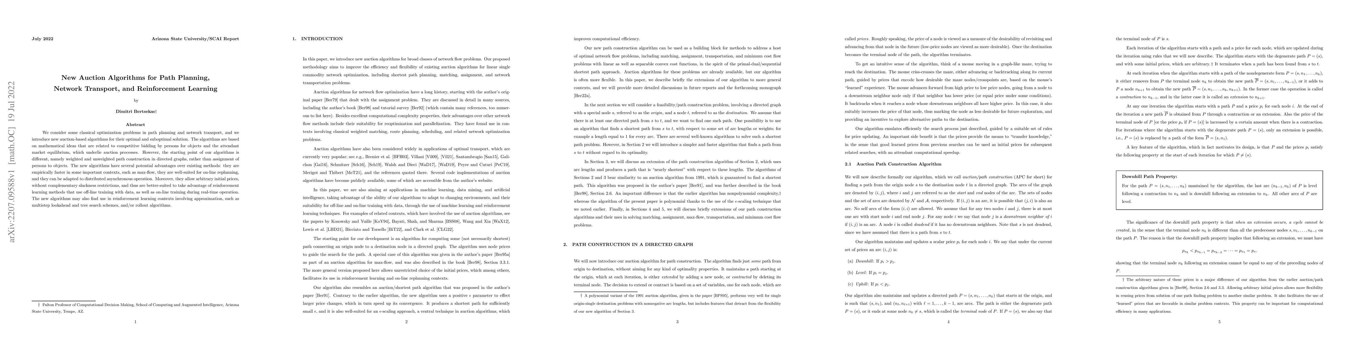 This paper introduces auction-based algorithms for optimal and suboptimal solutions in path planning, network transport, and reinforcement learning. These algorithms leverage competitive bidding principles for faster, adaptable, and reinforcement learning-friendly solutions, especially in max-flow scenarios.