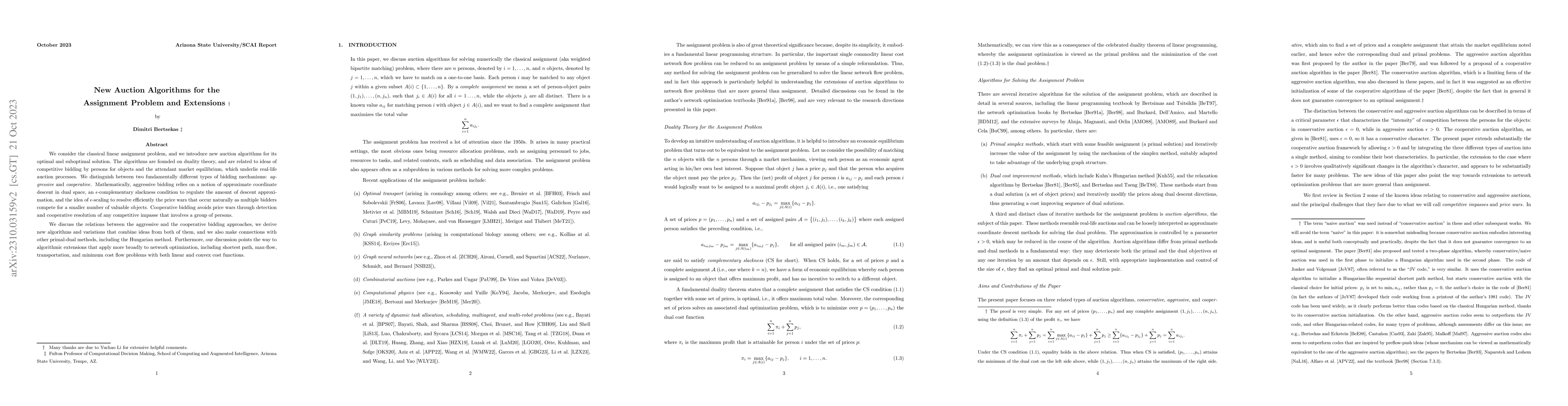 This paper introduces innovative auction algorithms for solving the linear assignment problem, distinguishing between aggressive and cooperative bidding mechanisms. The aggressive approach leverages approximate coordinate descent and epsilon-scaling, while the cooperative method resolves competitive impasses collaboratively. The study also explores algorithmic extensions applicable to network optimization problems.