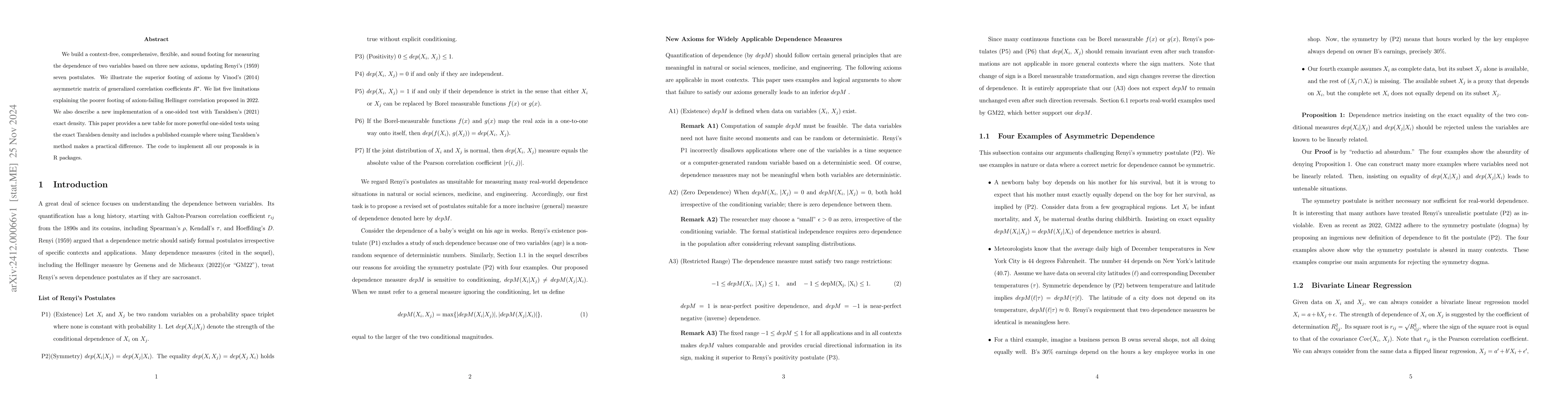 We build a context-free, comprehensive, flexible, and sound footing for measuring the dependence of two variables based on three new axioms, updating Renyi's (1959) seven postulates. We illustrate the superior footing of axioms by Vinod's (2014) asymmetric matrix of generalized correlation coefficients R*. We list five limitations explaining the poorer footing of axiom-failing Hellinger correlation proposed in 2022. We also describe a new implementation of a one-sided test with Taraldsen's (2021) exact density. This paper provides a new table for more powerful one-sided tests using the exact Taraldsen density and includes a published example where using Taraldsen's method makes a practical difference. The code to implement all our proposals is in R packages.