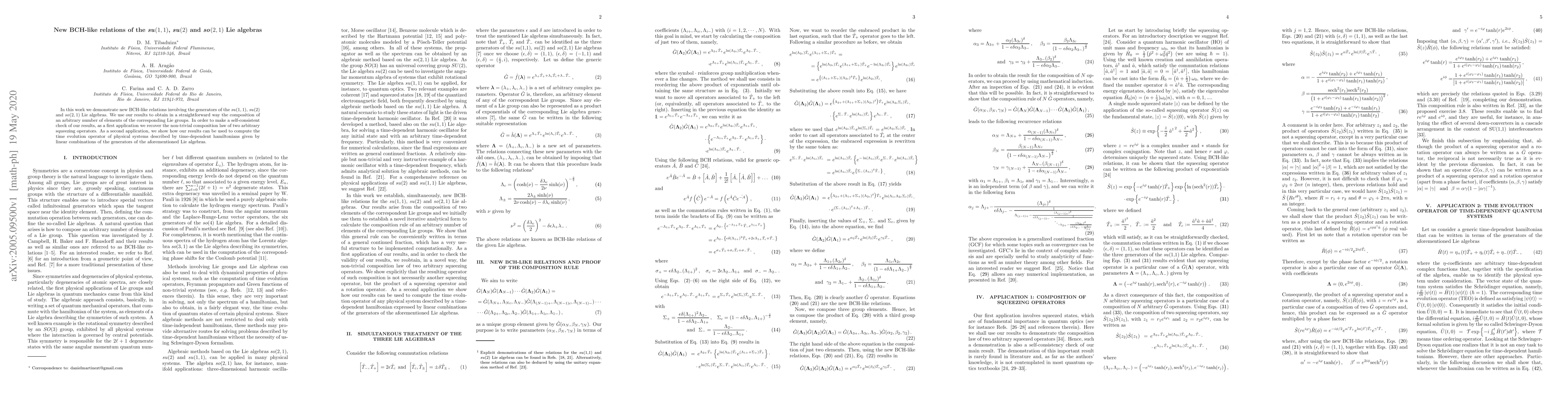 This paper introduces new BCH-like relations for the su(1, 1), su(2), and so(2, 1) Lie algebras, enabling straightforward composition of their group elements. Applications include deriving the composition law for squeezing operators and computing time evolution operators for systems with time-dependent Hamiltonians.