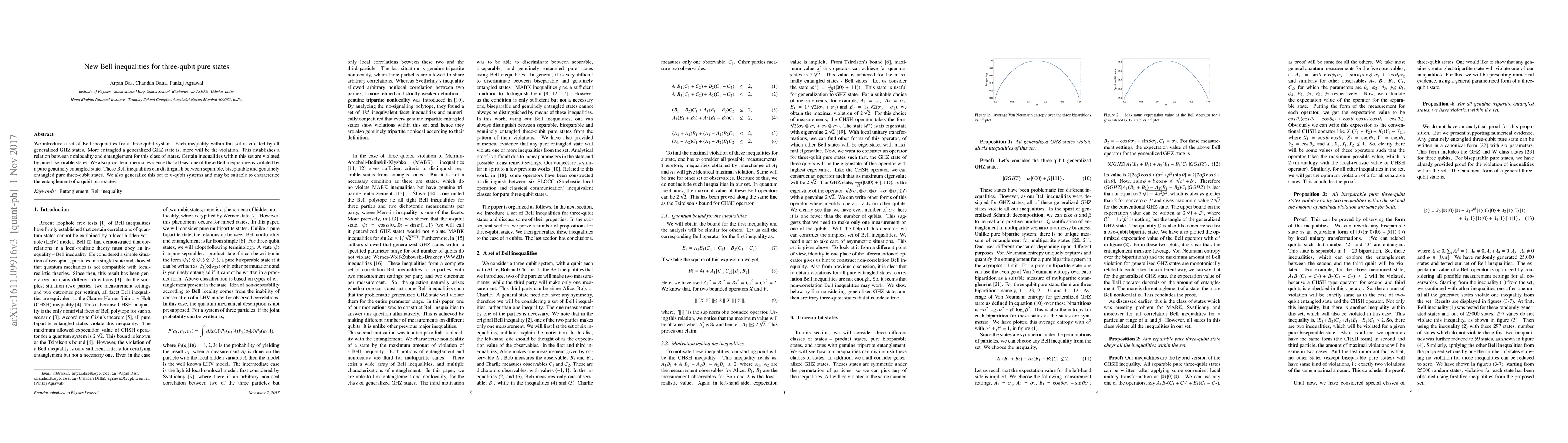 This paper introduces new Bell inequalities for three-qubit pure states, showing that they are violated by generalized GHZ states, especially by more entangled ones, thus linking nonlocality and entanglement. The inequalities can distinguish between separable, biseparable, and genuinely entangled states and are extended to n-qubit systems.