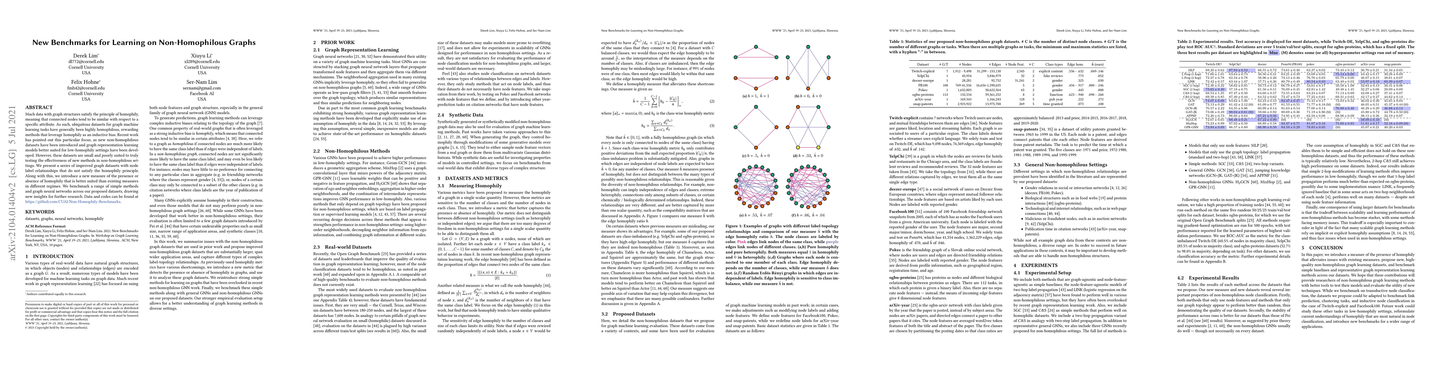 This paper introduces new benchmark datasets for learning on non-homophilous graphs, which challenge the common assumption of node similarity in graph structures. It also proposes an improved measure for assessing homophily and benchmarks various methods to provide insights for future research.