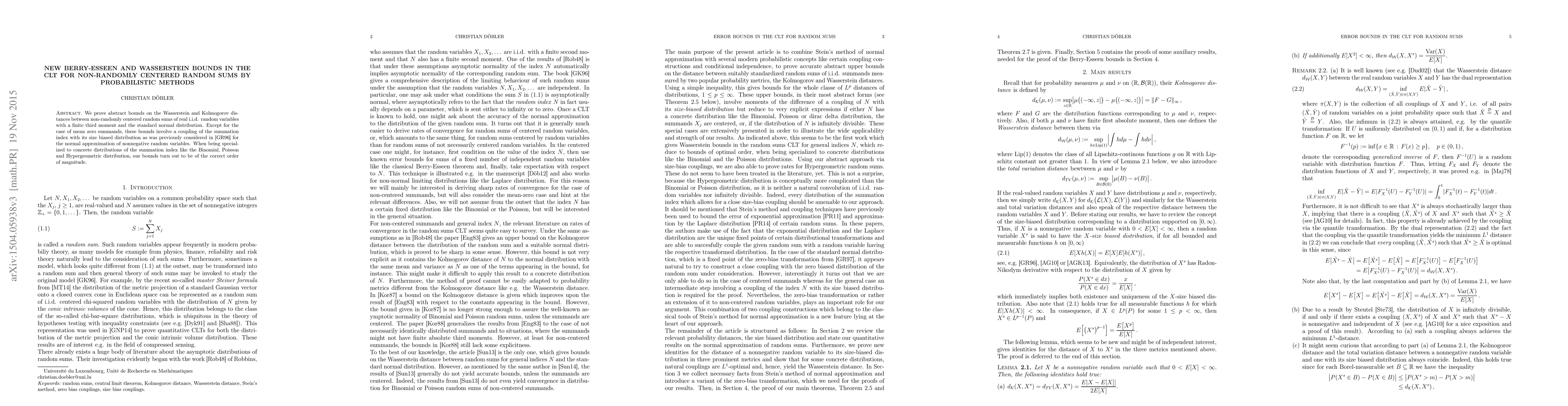 This paper establishes new bounds for Wasserstein and Kolmogorov distances in the Central Limit Theorem (CLT) for non-randomly centered random sums of i.i.d. random variables, leveraging probabilistic methods. The bounds are shown to be accurate when applied to specific summation indices like Binomial, Poisson, and Hypergeometric distributions.