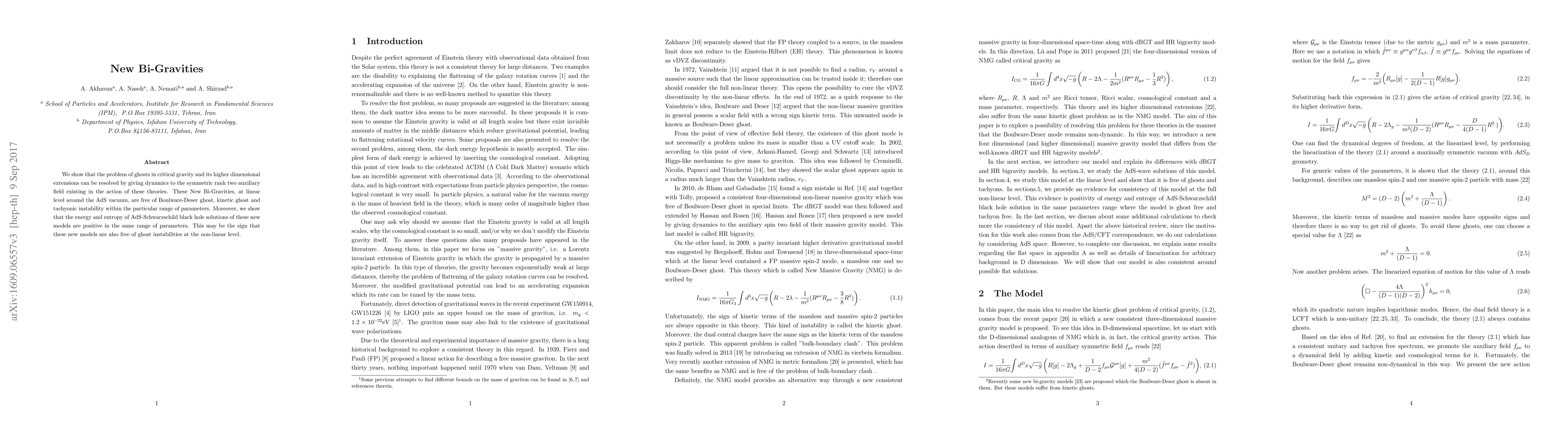 We show that the problem of ghosts in critical gravity and its higher dimensional extensions can be resolved by giving dynamics to the symmetric rank two auxiliary field existing in the action of these theories. These New Bi-Gravities, at linear level around the AdS vacuum, are free of Boulware-Deser ghost, kinetic ghost and tachyonic instability within the particular range of parameters. Moreover, we show that the energy and entropy of AdS-Schwarzschild black hole solutions of these new models are positive in the same range of parameters. This may be the sign that these new models are also free of ghost instabilities at the non-linear level.