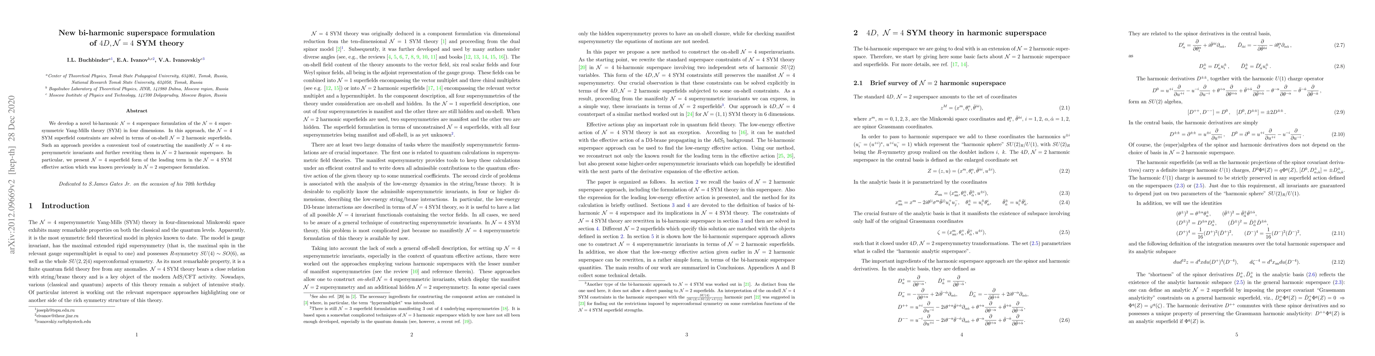 The paper introduces a new bi-harmonic superspace formulation for $\mathcal{N}=4$ supersymmetric Yang-Mills theory in four dimensions, solving $\mathcal{N}=4$ SYM superfield constraints using on-shell $\mathcal{N}=2$ harmonic superfields. It provides a method to construct $\mathcal{N}=4$ supersymmetric invariants and presents the leading term of the $\mathcal{N}=4$ SYM effective action in $\mathcal{N}=4$ superfield form.