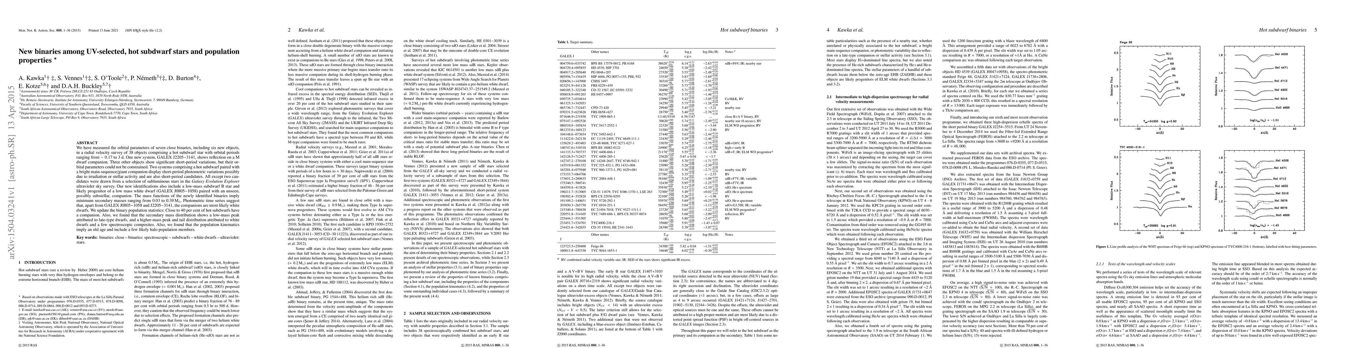 We have measured the orbital parameters of seven close binaries, including six new objects, in a radial velocity survey of 38 objects comprising a hot subdwarf star with orbital periods ranging from ~0.17 to 3 d. One new system, GALEX J2205-3141, shows reflection on a M dwarf companion. Three other objects show significant short-period variations, but their orbital parameters could not be constrained. Two systems comprising a hot subdwarf paired with a bright main-sequence/giant companion display short-period photometric variations possibly due to irradiation or stellar activity and are also short-period candidates. All except two candidates were drawn from a selection of subluminous stars in the Galaxy Evolution Explorer ultraviolet sky survey. Our new identifications also include a low-mass subdwarf B star and likely progenitor of a low mass white dwarf (GALEX J0805-1058) paired with an unseen, possibly substellar, companion. The mass functions of the newly identified binaries imply minimum secondary masses ranging from 0.03 to 0.39 M_solar. Photometric time series suggest that, apart from GALEX J0805-1058 and J2205-3141, the companions are most likely white dwarfs. We update the binary population statistics: Close to 40 per cent of hot subdwarfs have a companion. Also, we found that the secondary mass distribution shows a low-mass peak attributed to late-type dwarfs, and a higher-mass peak and tail distribution attributed to white dwarfs and a few spectroscopic composites. Also, we found that the population kinematics imply an old age and include a few likely halo population members.