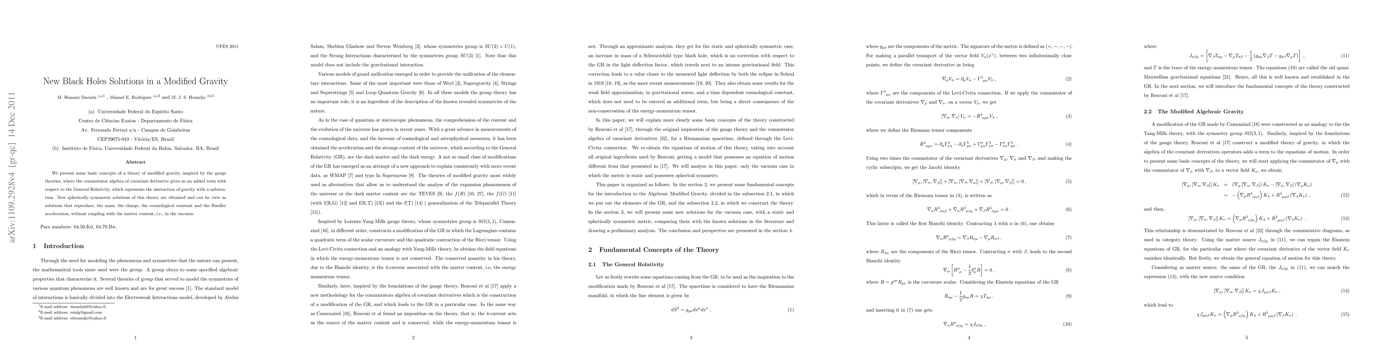 We present a theory of modified gravity, inspired by the gauge theories, where the commutator algebra of covariant derivative gives us an added term with respect to the General Relativity, which represents the interaction of gravity with a substratum. New spherically symmetric solutions of this theory are obtained and can be view as solutions that reproduce, the mass, the charge, the cosmological constant and the Rindler acceleration, without coupling with the matter content, i.e., in the vacuum.