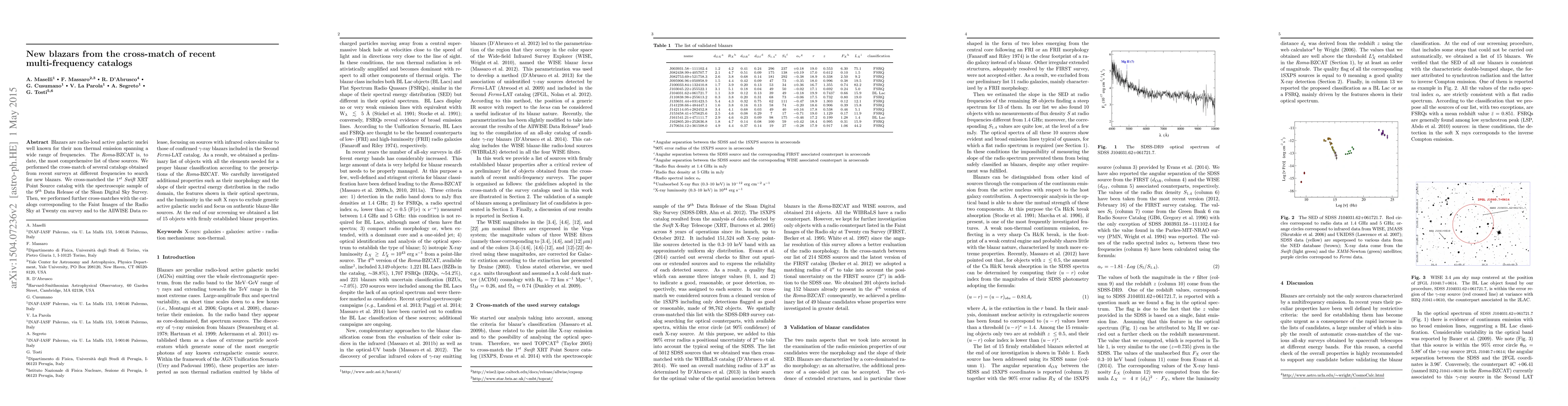 Blazars are radio-loud active galactic nuclei well known for their non thermal emission spanning a wide range of frequencies. The Roma-BZCAT is, to date, the most comprehensive list of these sources. We performed the cross-match of several catalogs obtained from recent surveys at different frequencies to search for new blazars. We cross-matched the 1$^{st}$ Swift-XRT Point Source catalog with the spectroscopic sample of the 9$^{th}$ Data Release of the Sloan Digital Sky Survey. Then, we performed further cross-matches with the catalogs corresponding to the Faint Images of the Radio Sky at Twenty cm survey and to the AllWISE Data release, focusing on sources with infrared colors similar to those of confirmed $\gamma$-ray blazars included in the Second Fermi-LAT catalog. As a result, we obtained a preliminary list of objects with all the elements needed for a proper blazar classification according to the prescriptions of the Roma-BZCAT. We carefully investigated additional properties such as their morphology and the slope of their spectral energy distribution in the radio domain, the features shown in their optical spectrum, and the luminosity in the soft X rays to exclude generic active galactic nuclei and focus on authentic blazar-like sources. At the end of our screening we obtained a list of 15 objects with firmly established blazar properties.