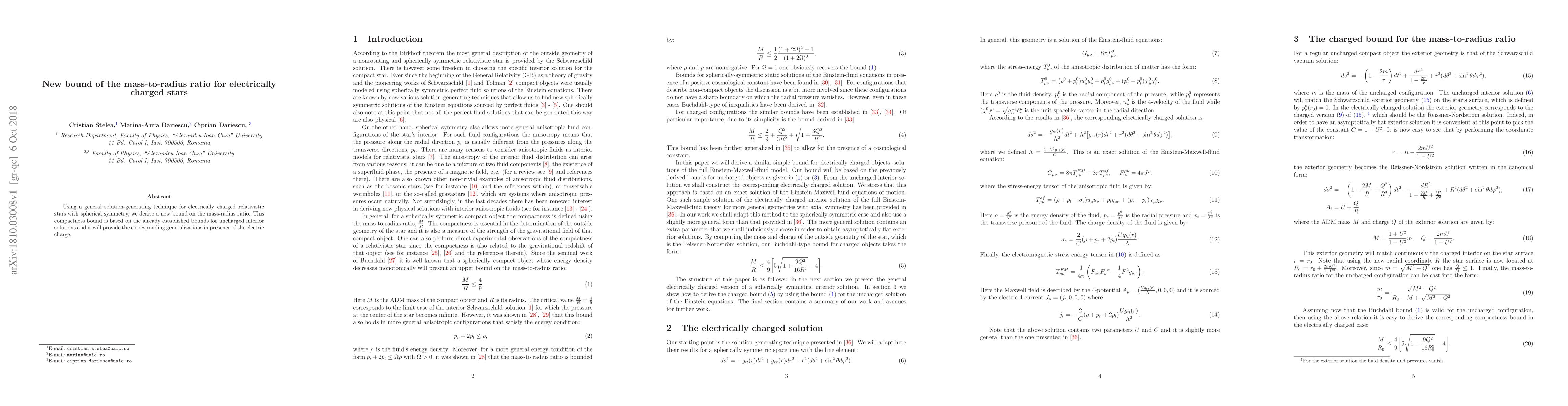 Using a general solution-generating technique for electrically charged relativistic stars with spherical symmetry, we derive a new bound on the mass-radius ratio. This compactness bound is based on the already established bounds for uncharged interior solutions and it will provide the corresponding generalizations in presence of the electric charge.