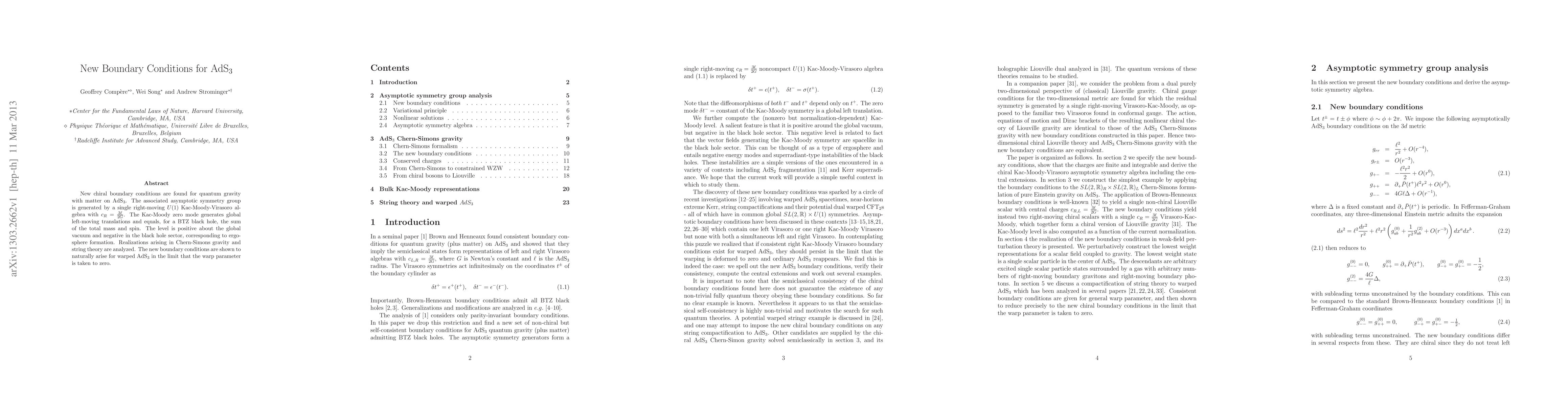 New chiral boundary conditions are found for quantum gravity with matter on AdS3. The associated asymptotic symmetry group is generated by a single right-moving U(1) Kac-Moody-Virasoro algebra with c_R = 3l/2G. The Kac-Moody zero mode generates global left-moving translations and equals, for a BTZ black hole, the sum of the total mass and spin. The level is positive about the global vacuum and negative in the black hole sector, corresponding to ergosphere formation. Realizations arising in Chern-Simons gravity and string theory are analyzed. The new boundary conditions are shown to naturally arise for warped AdS3 in the limit that the warp parameter is taken to zero.