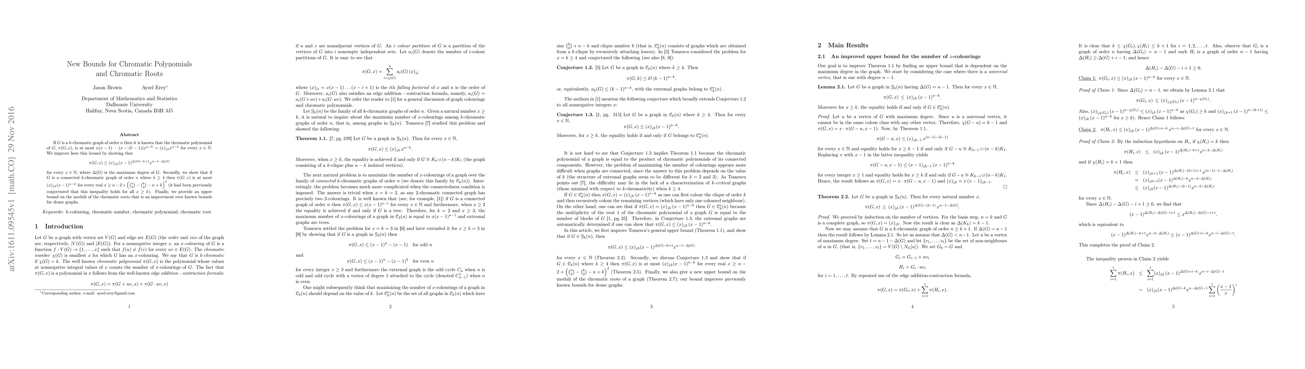 This paper presents improved bounds on the chromatic polynomial of $k$-chromatic graphs, showing $\pi(G,x) \leq (x)_{\downarrow k} (x-1)^{\Delta(G)-k+1} x^{n-1-\Delta(G)}$ for all natural $x$. It also establishes a tighter upper bound for connected $k$-chromatic graphs when $k \geq 4$, and provides a better upper bound on the moduli of chromatic roots for dense graphs.