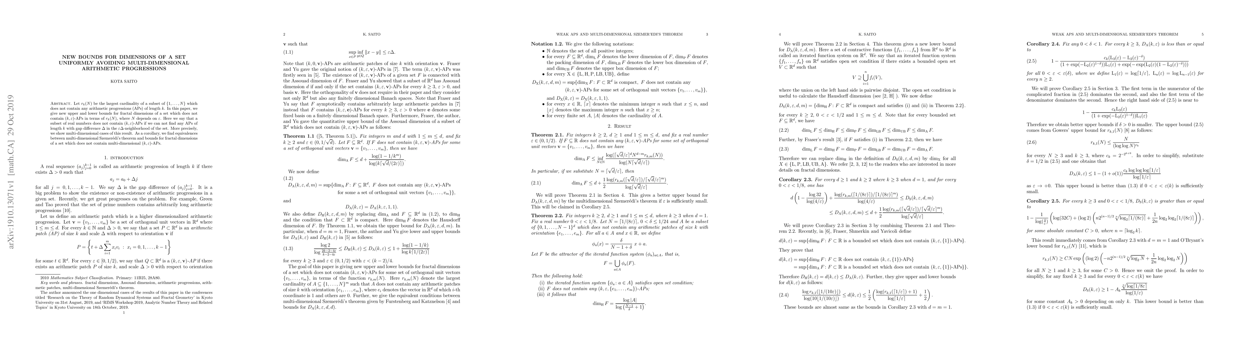 Let $r_k(N)$ be the largest cardinality of a subset of $\{1,\ldots,N\}$ which does not contain any arithmetic progressions (APs) of length $k$. In this paper, we give new upper and lower bounds for fractal dimensions of a set which does not contain $(k,\epsilon)$-APs in terms of $r_k(N)$, where $N$ depends on $\epsilon$. Here we say that a subset of real numbers does not contain $(k,\epsilon)$-APs if we can not find any APs of length $k$ with gap difference $\Delta$ in the $\epsilon \Delta$-neighborhood of the set. More precisely, we show multi-dimensional cases of this result. As a corollary, we find equivalences between multi-dimensional Szemer\'edi's theorem and bounds for fractal dimensions of a set which does not contain multi-dimensional $(k,\epsilon)$-APs.