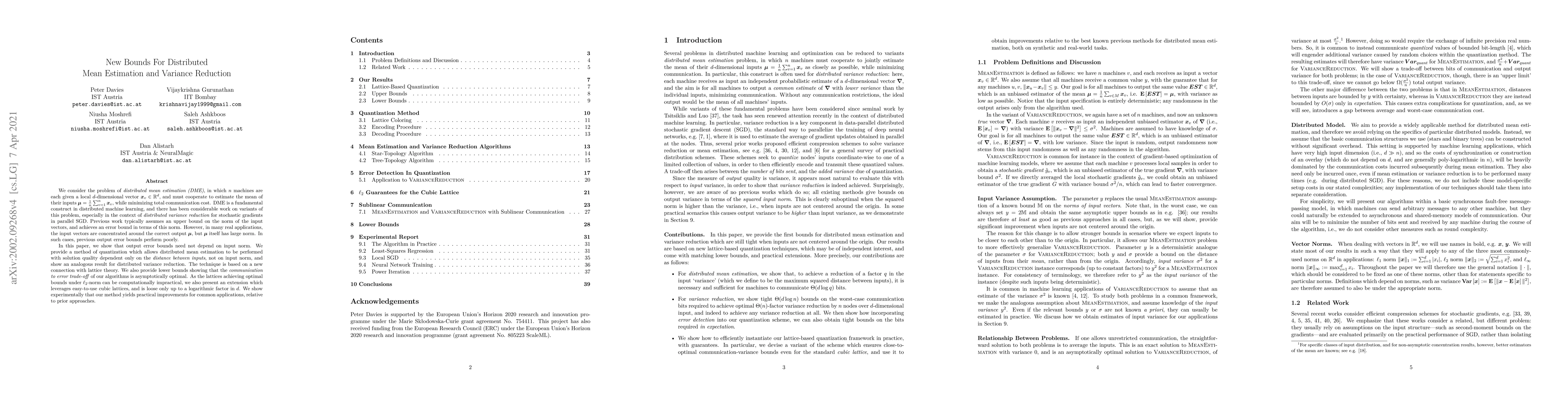 We consider the problem of distributed mean estimation (DME), in which $n$ machines are each given a local $d$-dimensional vector $x_v \in \mathbb{R}^d$, and must cooperate to estimate the mean of their inputs $\mu = \frac 1n\sum_{v = 1}^n x_v$, while minimizing total communication cost. DME is a fundamental construct in distributed machine learning, and there has been considerable work on variants of this problem, especially in the context of distributed variance reduction for stochastic gradients in parallel SGD. Previous work typically assumes an upper bound on the norm of the input vectors, and achieves an error bound in terms of this norm. However, in many real applications, the input vectors are concentrated around the correct output $\mu$, but $\mu$ itself has large norm. In such cases, previous output error bounds perform poorly. In this paper, we show that output error bounds need not depend on input norm. We provide a method of quantization which allows distributed mean estimation to be performed with solution quality dependent only on the distance between inputs, not on input norm, and show an analogous result for distributed variance reduction. The technique is based on a new connection with lattice theory. We also provide lower bounds showing that the communication to error trade-off of our algorithms is asymptotically optimal. As the lattices achieving optimal bounds under $\ell_2$-norm can be computationally impractical, we also present an extension which leverages easy-to-use cubic lattices, and is loose only up to a logarithmic factor in $d$. We show experimentally that our method yields practical improvements for common applications, relative to prior approaches.