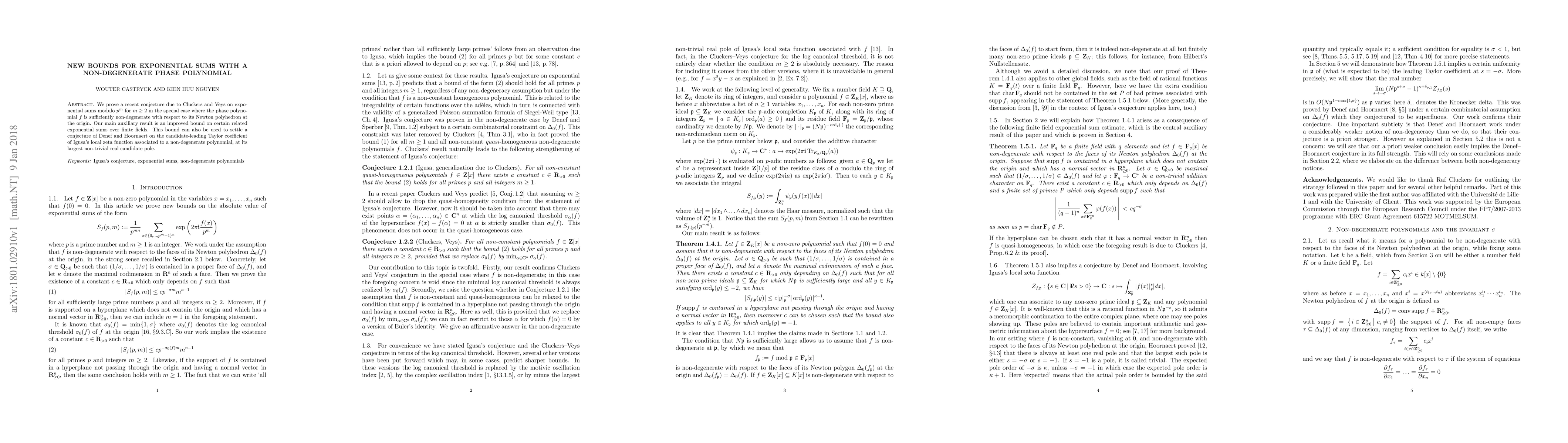 The paper proves a conjecture by Cluckers and Veys on exponential sums modulo $p^m$ for $m \geq 2$ when the phase polynomial is sufficiently non-degenerate, and also provides an improved bound on related exponential sums over finite fields, which helps settle a conjecture by Denef and Hoornaert on Igusa's local zeta function.