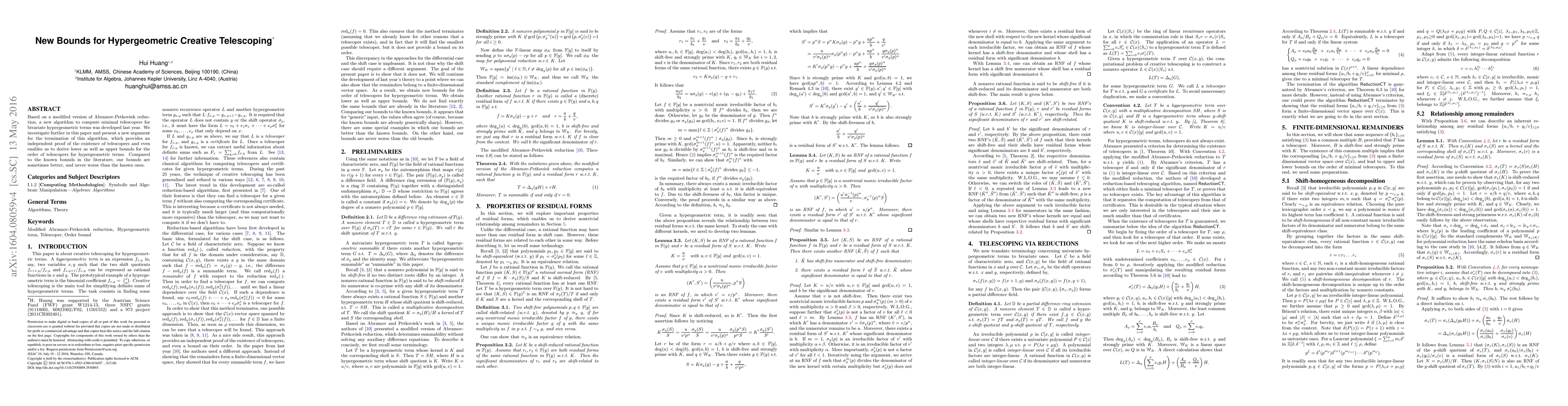 Based on a modified version of Abramov-Petkov\v{s}ek reduction, a new algorithm to compute minimal telescopers for bivariate hypergeometric terms was developed last year. We investigate further in this paper and present a new argument for the termination of this algorithm, which provides an independent proof of the existence of telescopers and even enables us to derive lower as well as upper bounds for the order of telescopers for hypergeometric terms. Compared to the known bounds in the literature, our bounds are sometimes better, and never worse than the known ones.