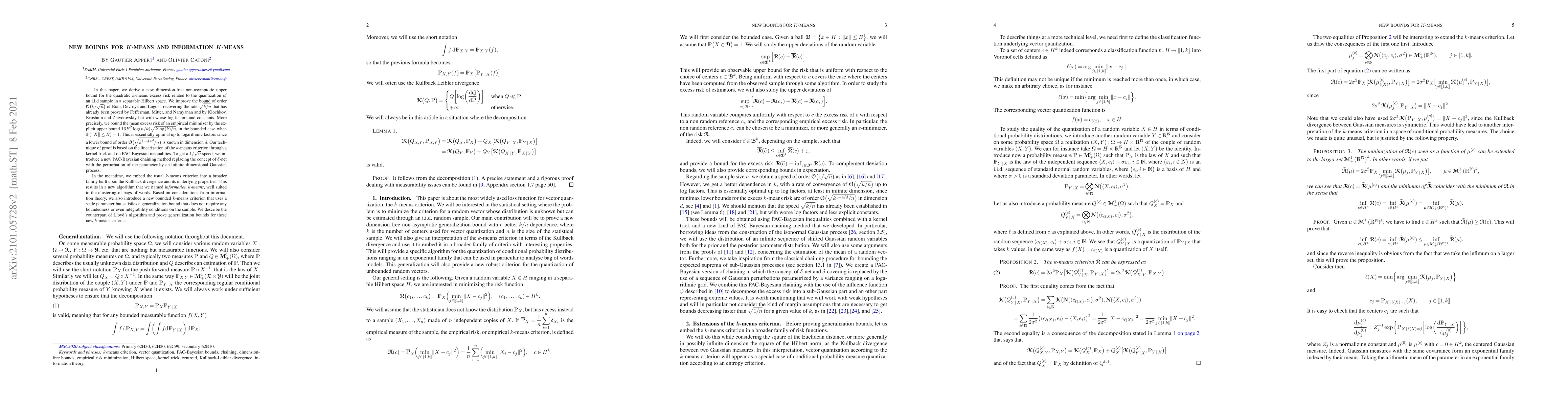 In this paper, we derive a new dimension-free non-asymptotic upper bound for the quadratic $k$-means excess risk related to the quantization of an i.i.d sample in a separable Hilbert space. We improve the bound of order $\mathcal{O} \bigl( k / \sqrt{n} \bigr)$ of Biau, Devroye and Lugosi, recovering the rate $\sqrt{k/n}$ that has already been proved by Fefferman, Mitter, and Narayanan and by Klochkov, Kroshnin and Zhivotovskiy but with worse log factors and constants. More precisely, we bound the mean excess risk of an empirical minimizer by the explicit upper bound $16 B^2 \log(n/k) \sqrt{k \log(k) / n}$, in the bounded case when $\mathbb{P}( \lVert X \rVert \leq B) = 1$. This is essentially optimal up to logarithmic factors since a lower bound of order $\mathcal{O} \bigl( \sqrt{k^{1 - 4/d}/n} \bigr)$ is known in dimension $d$. Our technique of proof is based on the linearization of the $k$-means criterion through a kernel trick and on PAC-Bayesian inequalities. To get a $1 / \sqrt{n}$ speed, we introduce a new PAC-Bayesian chaining method replacing the concept of $\delta$-net with the perturbation of the parameter by an infinite dimensional Gaussian process. In the meantime, we embed the usual $k$-means criterion into a broader family built upon the Kullback divergence and its underlying properties. This results in a new algorithm that we named information $k$-means, well suited to the clustering of bags of words. Based on considerations from information theory, we also introduce a new bounded $k$-means criterion that uses a scale parameter but satisfies a generalization bound that does not require any boundedness or even integrability conditions on the sample. We describe the counterpart of Lloyd's algorithm and prove generalization bounds for these new $k$-means criteria.