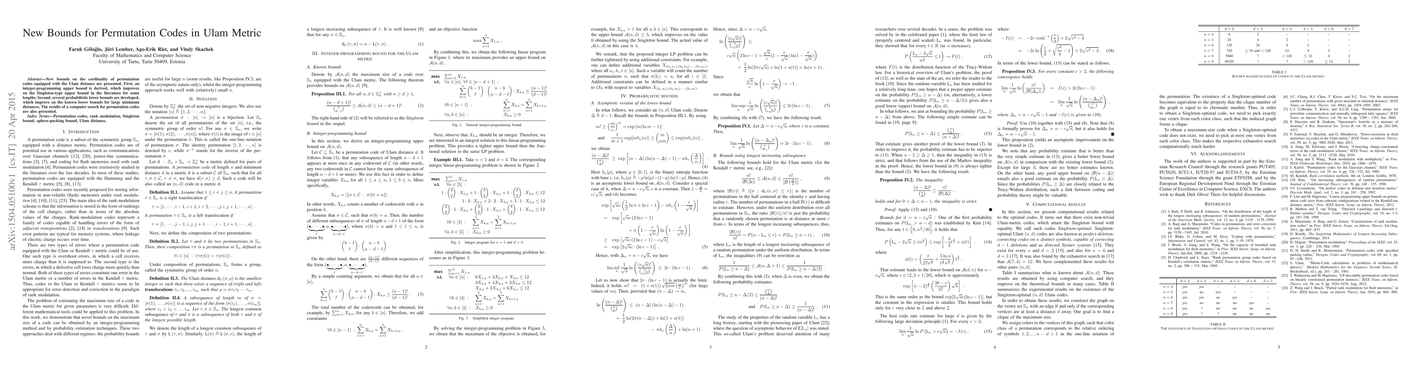 This paper presents improved bounds for the cardinality of permutation codes under the Ulam metric, including a new integer-programming upper bound that surpasses existing Singleton-type bounds for certain lengths, and probabilistic lower bounds that enhance known limits for large minimum distances. Additionally, results from a computer search for permutation codes are reported.
