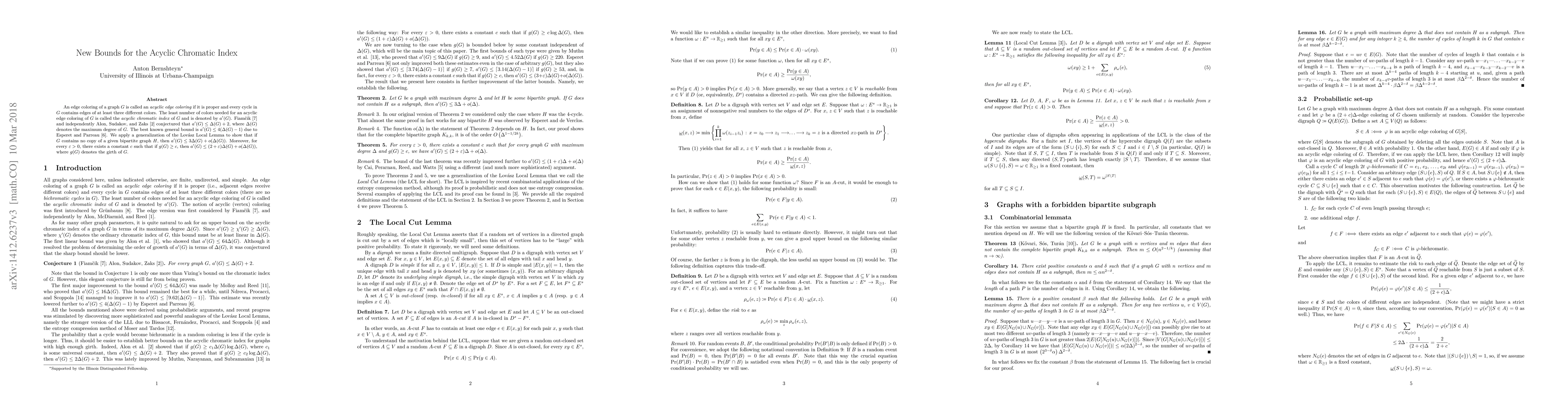 This paper presents new bounds for the acyclic chromatic index $a'(G)$, showing that $a'(G) \leq 3\Delta(G)+o(\Delta(G))$ if $G$ contains no copy of a given bipartite graph $H$. It also proves that for large girth $g(G)$, $a'(G)$ can be bounded by $(2+\varepsilon)\Delta(G)+o(\Delta(G))$.