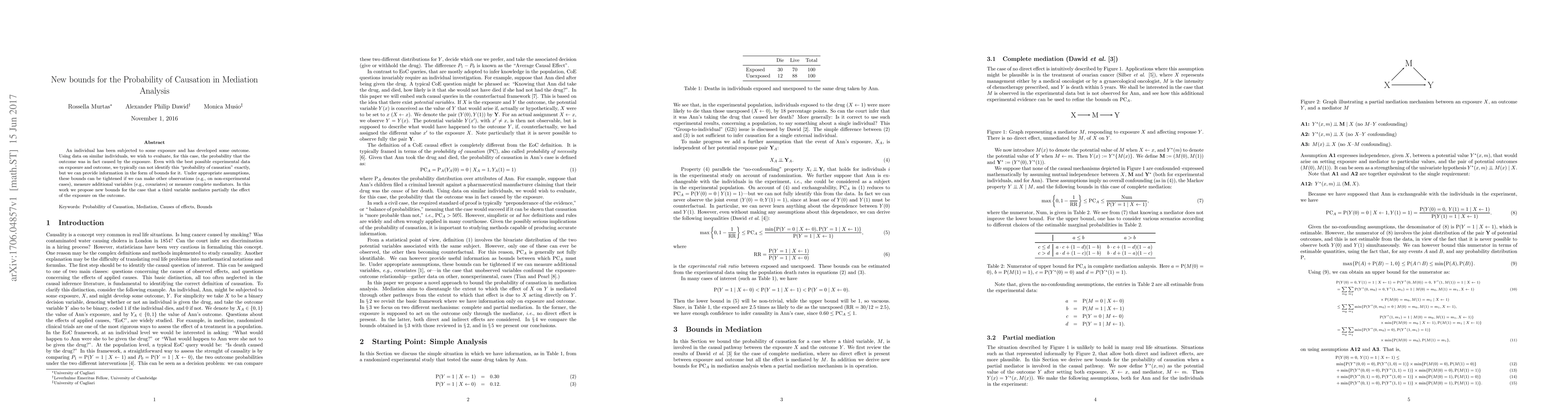 An individual has been subjected to some exposure and has developed some outcome. Using data on similar individuals, we wish to evaluate, for this case, the probability that the outcome was in fact caused by the exposure. Even with the best possible experimental data on exposure and outcome, we typically can not identify this "probability of causation" exactly, but we can provide information in the form of bounds for it. Under appropriate assumptions, these bounds can be tightened if we can make other observations (e.g., on non-experimental cases), measure additional variables (e.g., covariates) or measure complete mediators. In this work we propose new bounds for the case that a third variable mediates partially the effect of the exposure on the outcome.