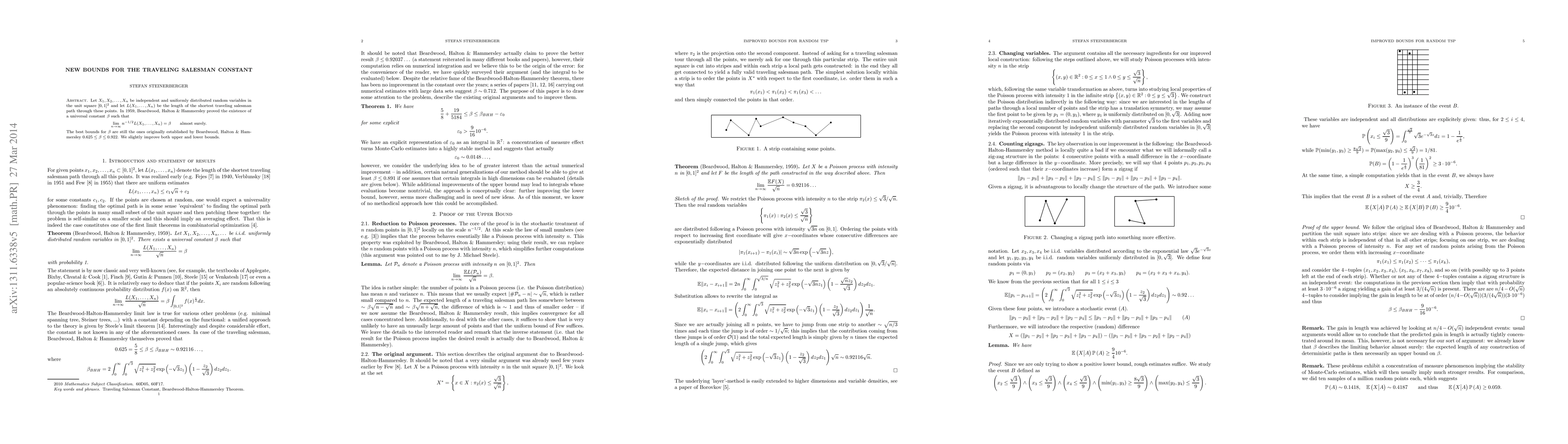 Let $X_1, X_2, \dots, X_n$ be independent and uniformly distributed random variables in the unit square $[0,1]^2$ and let $L(X_1, \dots, X_n)$ be the length of the shortest traveling salesman path through these points. In 1959, Beardwood, Halton $\&$ Hammersley proved the existence of a universal constant $\beta$ such that $$ \lim_{n \rightarrow \infty}{n^{-1/2}L(X_1, \dots, X_n)} = \beta \qquad \mbox{almost surely.}$$ The best bounds for $\beta$ are still the ones originally established by Beardwood, Halton $\&$ Hammersley $0.625 \leq \beta \leq 0.922$. We slightly improve both upper and lower bounds.